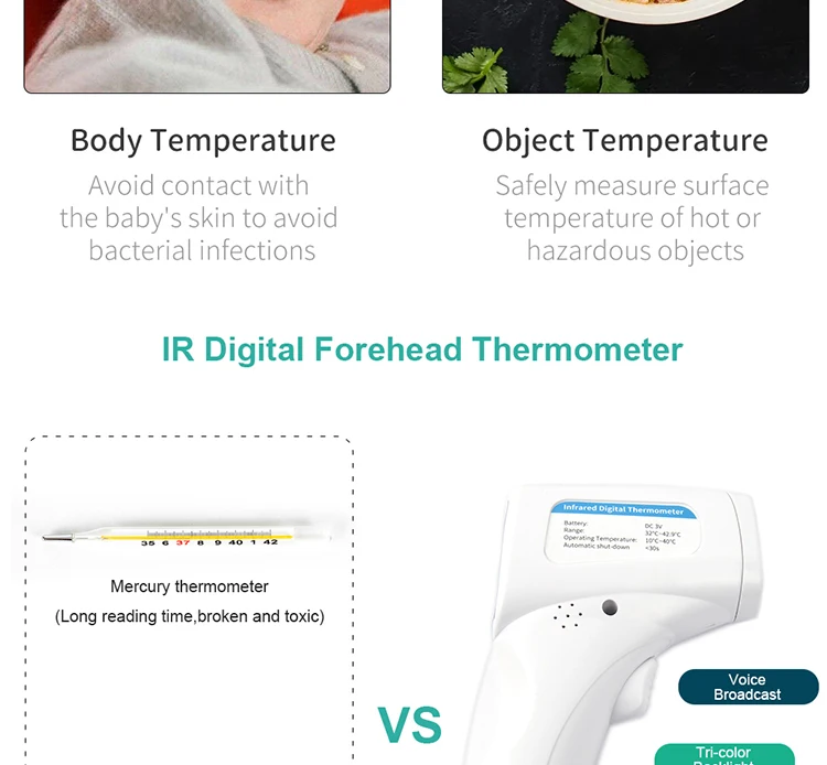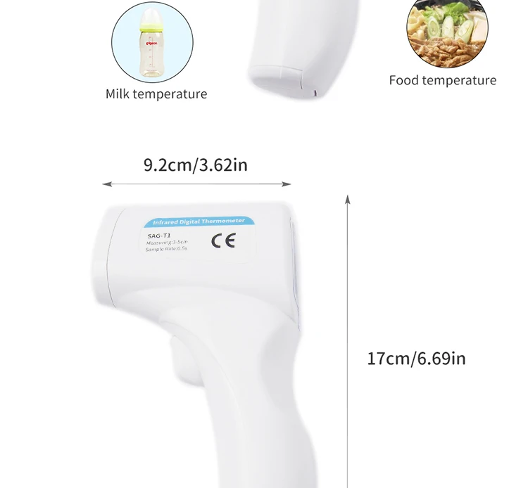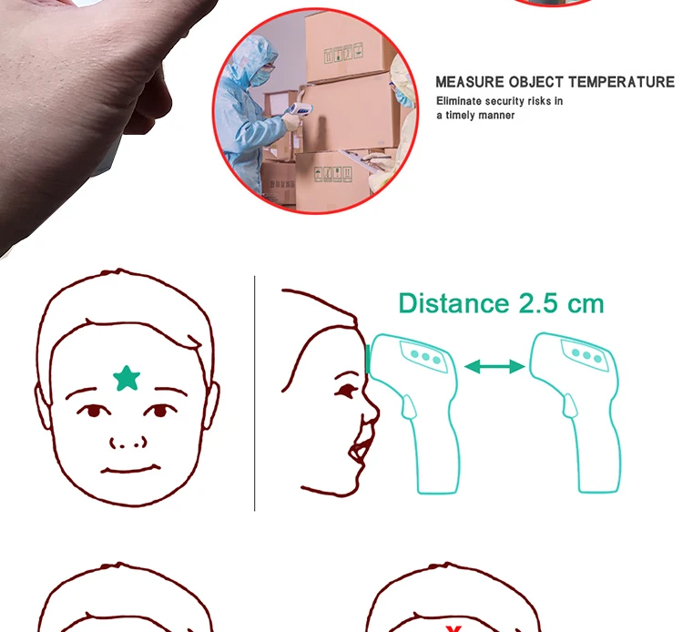 Тип изделия: Инфракрасный термометр для лба Диапазон температур: 32-42,9 ℃ Рабочая температура: 10-40 ℃ Аккумулятор: 3 В постоянного тока. Пожалуйста, обратите внимание, что наши продукты не включают аккумулятор, потому что транспортная компания не будет отправлять товар с батареей. Вам может потребоваться купить аккумулятор самостоятельно и применить его, прежде чем использовать этот товар. Расстояние измерения: 3-5 см. Вы можете использовать это на лбу и теле людей. Особенности 1. Скорость. Возьмите температуру <1 секунду, вам не нужно ждать так долго, как ртутный термометр. 2. Точный. Мути-фуцион цифровой термометр измеряет температуру вашего тела в считанные секунды, и ошибка ≤ 0,2 ℃. 3. Сигнал тревоги. Когда температура вашего тела ≥ 38 ℃. Затем термометр будет автоматически оповещать вас о вашем здоровье. 4. Convient. Вы больше не поедете в госпиталь для измерения температуры, с этим товаром, вы можете измерить его в любом месте в любое время. Бесплатная доставка по всему миру.