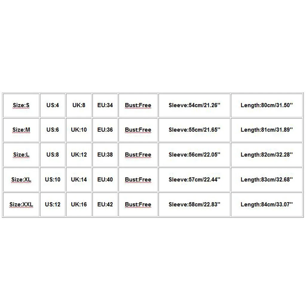 Что вы получаете: 1 шт. женский кардиганРазмер США Великобритания ЕС Бюст Рукав Длина S 4 8 34 Бесплатно 54 см/21,26'' 80 см/31,50'' М 6 10 36 Бесплатно 55 см/21,65'' 81 см/31,89'' L 8 12 38 Бесплатно 56 см/22,05'' 82 см/32,28'' XL 10 14 40 Бесплатно 57 см/22,44'' 83 см/32,68'' XXL 12 16 42 Бесплатно 58 см/22,83'' 84 см/33,07''