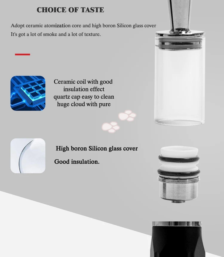 1. Мини-размер, легко носить с собой. 2. Сменная нагревательная катушка, экономит стоимость. 3. Керамическая нагревательная катушка, быстрый нагрев и чистый вкус. 4. 3 режима питания; Зеленый (12 Вт), синий (10 Вт), красный (8 Вт) 5. Сверхурочная защита, При парении более 15 с, она автоматически отключится.