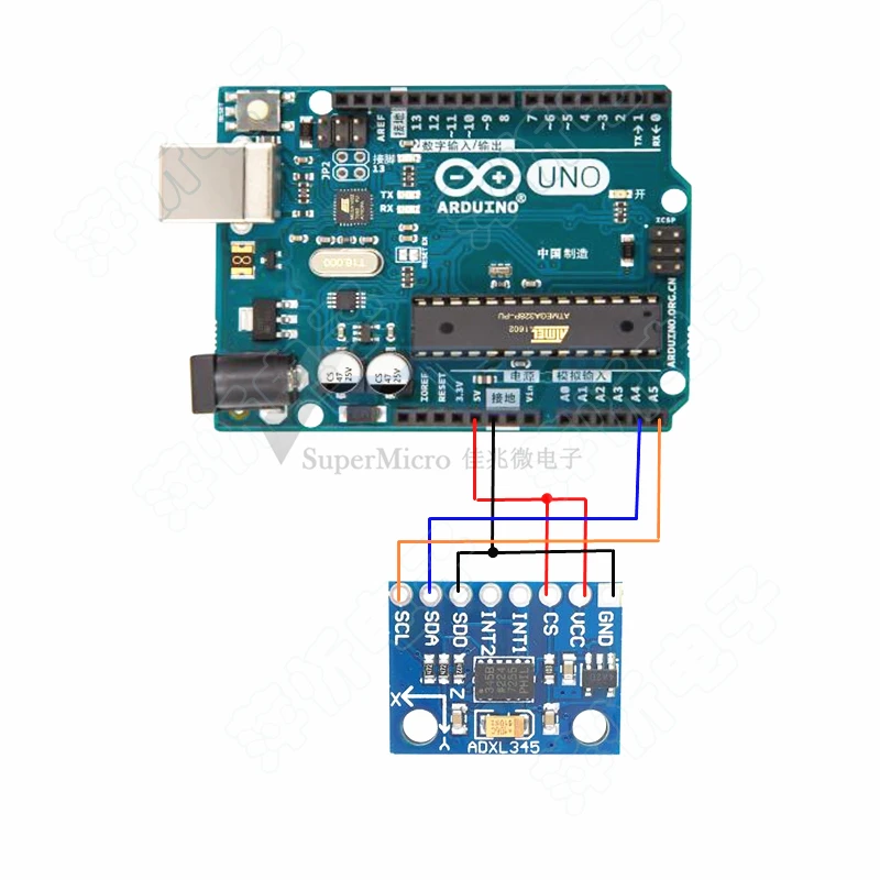 Примечание: этот метод подключения подходит для связи между IIC ADXL345 и Uno. Если вы используете другие контрольные платы, контакты IIC могут отличаться, пожалуйста, проверьте соответствующие контакты, чтобы убедиться, что проводка правильная. Для использования режима связи SPI adxl345