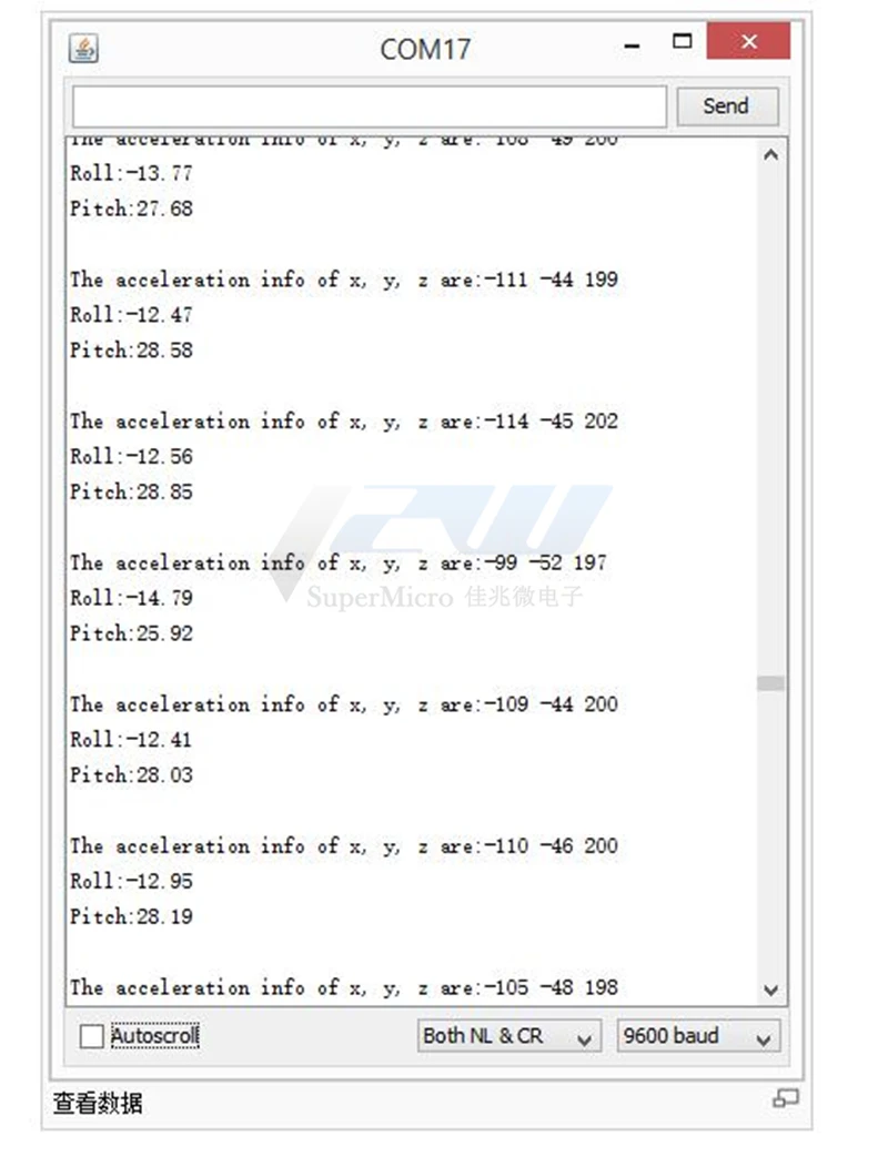 Откройте Окно мониторинга последовательного порта, и вы можете увидеть данные, похожие на следующую диаграмму, которые: данные трехосного ускорения, И рулон и угол наклона в порядке вращения R-xyz. Поверните по каждой оси, чтобы наблюдать соответствующие изменения данных.