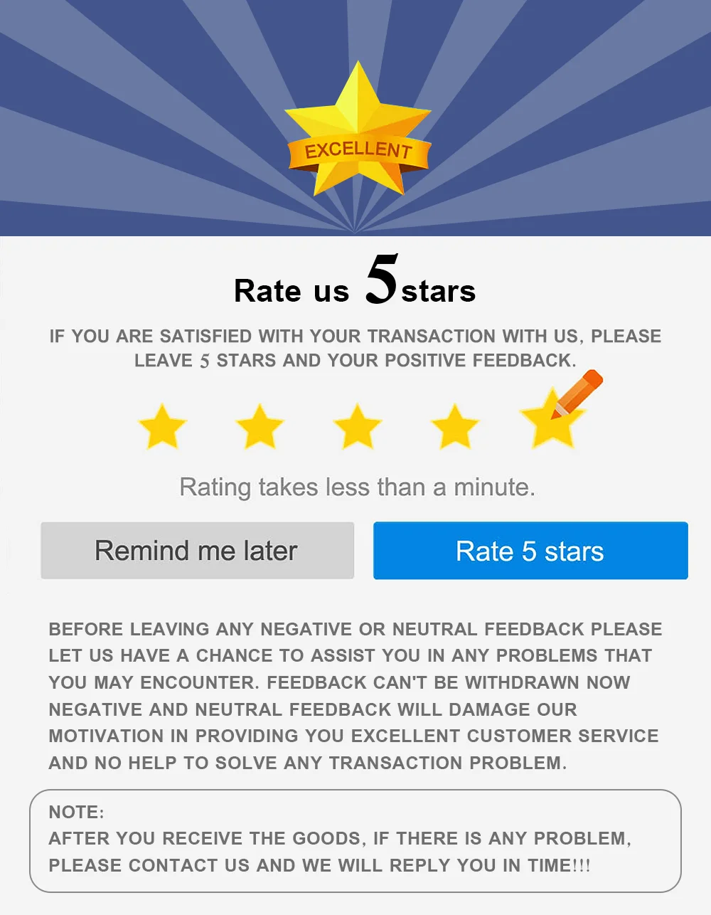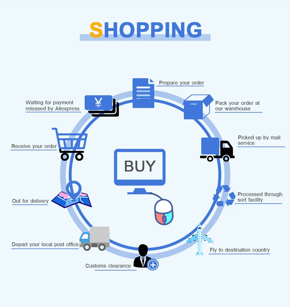 1. Пожалуйста, сначала проверьте и проверьте, когда вы получите посылку, ваши положительные отзывы помогут нам двигаться вперед. Если есть какие-либо проблемы, пожалуйста, свяжитесь с нами напрямую, мы сделаем все возможное. 2. Пожалуйста, выберите способ доставки при размещении заказа, мы отправим вам товар лучшего качества в течение 2 рабочих дней после завершения оплаты. Мы не гарантируем время доставки на все международные перевозки из-за различных таможенного оформления и инспекции между каждой страной. 3. Пожалуйста, свяжитесь с нами, если вы не получили посылка через 30 дней после оплаты, мы Отследим ваш заказ и свяжемся с Вами как можно скорее. Наша цель-удовлетворение клиентов. 4. Пожалуйста, имейте в виду, что мы имеем право выбрать способ экспресс-доставки при условии бесплатной доставки. 5. Примечание покупателя: Пожалуйста, попросите нас продлить время получения товара, если вы не получили ваш товар вовремя. Спасибо за сотрудничество.