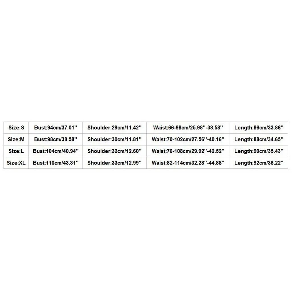 Размер Бюст Плечо Талия Длина S 94 см/37,01'' 29 см/11,42'' 66-98 см/25,98 ''-38,58'' 86 см/33,86'' М 98 см/38,58'' 30 см/11,81'' 70-102 см/27,56 ''-40,16'' 88 см/34,65'' L 104 см/40,94'' 32 см/12,60'' 76-108 см/29,92 ''-42,52'' 90 см/35,43'' XL 110 см/43,31'' 33 см/12,99 дюйма 82-114 см/32,28 ''-44,88'' 92 см/36,22''