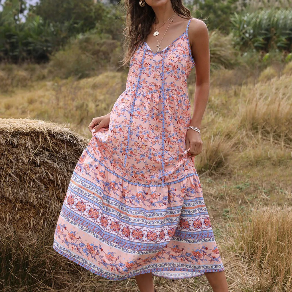Весенне-летнее свободное платье на бретельках с v-образным вырезом и принтом в стиле бохо.