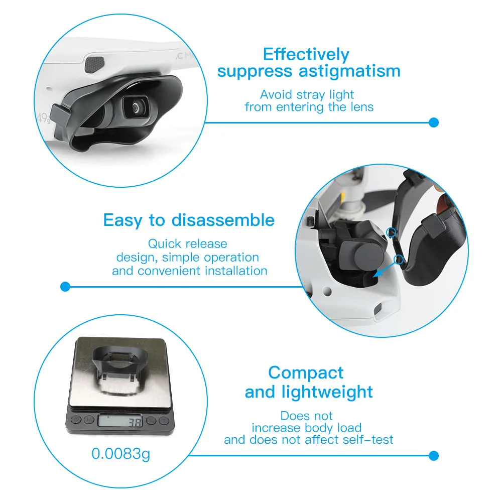 Мини и легкий, не увеличивает нагрузку на Дрон Эффективно уменьшает астигматизм изображения и предотвращает попадание паразитарного светильник в объектив Подходит для дизайна корпуса, стабильный и надежный Улучшенная конструкция боковой панели, усиливает функцию затенения и увеличивает высоту, что может эффективно защитить шарнир и объектив при посадке Быстросъемный дизайн, легко монтируется и демонтируется Получайте лучшие аэрофотоснимки и видео, особенно съемки на солнце Подходит для DJI Mavic Mini DroneПосылка: