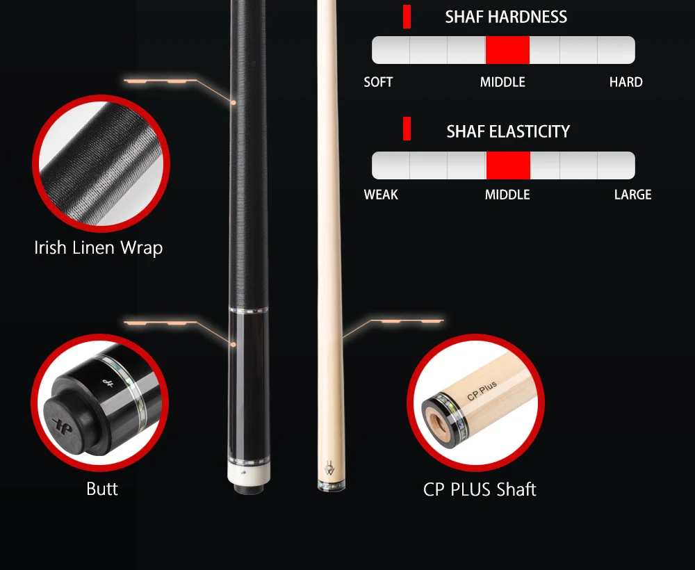 5А канадский клен Вал: профессиональный, как CP вал Совет: Как М Наконечник Задник: эбеновое дерево, Кокоболо красное дерево Подлинная ирландская льняная обертка Резиновая подошва, защита от ударов Стабильное качество, профессиональный бильярдный кий, черный 8 кий. Соединение из нержавеющей стали.