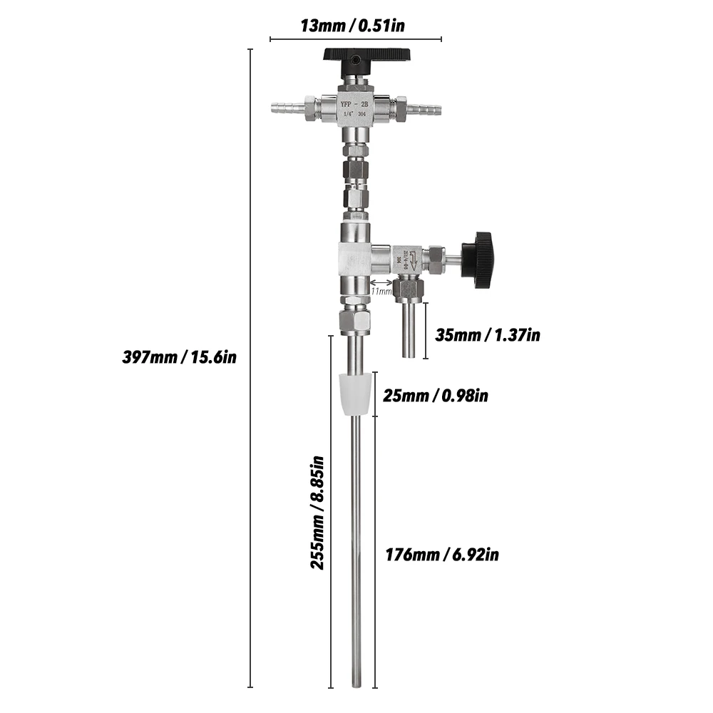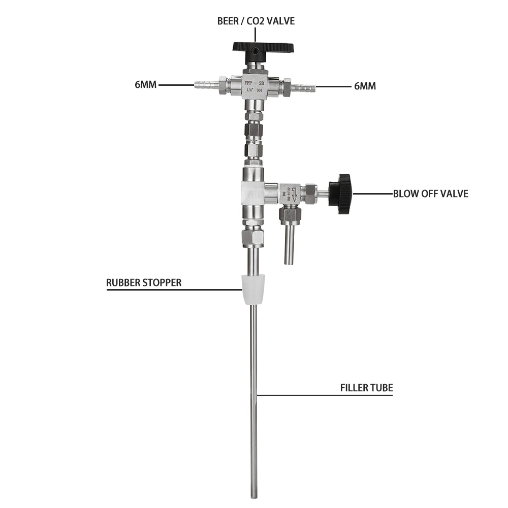 Оснащен специальным клапаном, который позволяет СО2 и пиву распылять одну и ту же нержавеющую трубку прямо на дно бутылки.