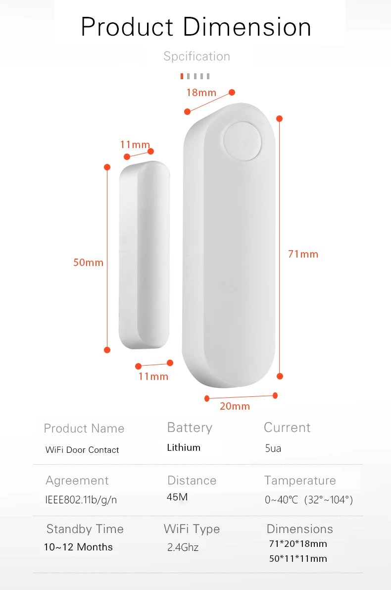Примечание: Этот дверной датчик работает только с Wi-Fi роутером 2,4G Hz. Широкий зазор позволяет достигать 1 см при закрытии двери/окна. Датчик двери работает с батареей 1xCR2(Аккумулятор включен). Пожалуйста, прочитайте шаги подключения по рекламе и руководство по эксплуатации, которое находится в посылка перед установкой дверного датчика.