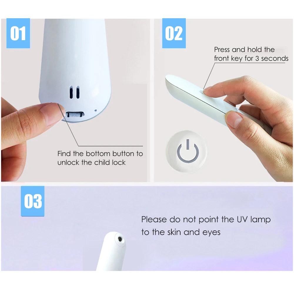 Безопасный дизайн --- для безопасности, этот УФ-светильник-дезинфицирующее средство имеет детский замок, который может помочь защитить членов вашей семьи или домашних животных от попадания в УФ-светильник. Забота о вашей семье и домашних животных.