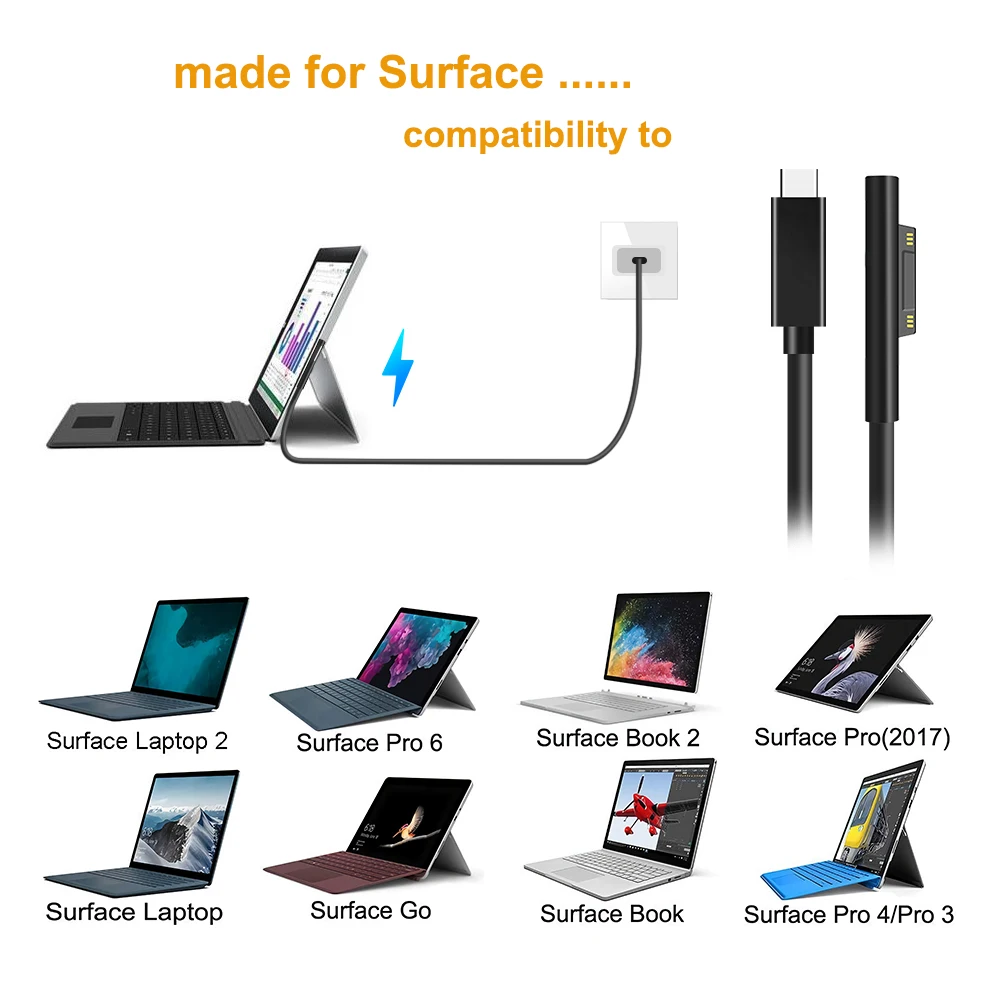 Хотите зарядить Microsoft Surface on-the-go? Этот кабель преобразует фирменный порт Microsoft Surface Connect, используемый для зарядки, для USB-C питания. Идеально подходит для зарядки поверхности с помощью внешнего аккумулятора (см. Требования ниже). 1) Проверьте поверхность Microsoft для требований к зарядке 2) Проверьте выходное напряжение и напряжение вашего зарядного устройства Microsoft 3) Проверьте USB-C выход и напряжение питания PD Этот кабель заряжает до 15 В/3 А (45 Вт). Для USB-C питания требуется питание (PD) при напряжении 15 в Microsoft поверхности Go: 30 Вт PD (15V/2A) или 45 Вт PD (15V/3A) Microsoft Surface Pro 3/4/5/6: 45 Вт PD (15V/3A) или большее количество Microsoft поверхность ноутбука: 45 Вт PD (15V/3A) или большее количество Microsoft Surface Book 1/2: 45 Вт PD (15V/3A) или большее количество Зарядный кабель Surface Pro 15V PD совместим с моделями планшетов Microsoft surface, ноутбуков Планшет Microsoft Surface Pro 3 Планшет Microsoft Surface Pro 4 Windows i5 i7 Планшет Microsoft Surface Pro 5 Планшет Microsoft Surface Pro 6 Планшет Microsoft Surface Book 1 Планшет Microsoft Surface Book 2 Microsoft Surface Go Ноутбук Microsoft Surface 1 Ноутбук Microsoft Surface 2