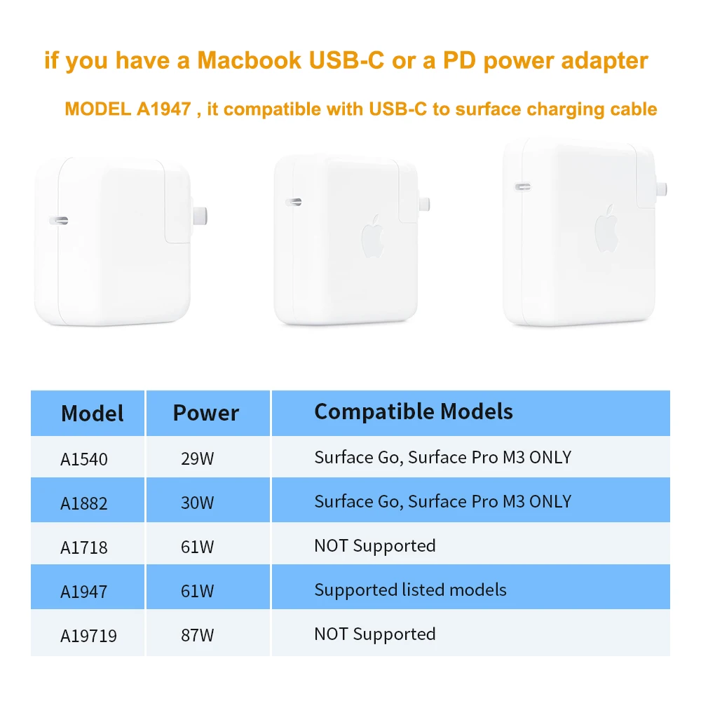 18 Вт, 24 Вт и 29 Вт не будут работать. Если зарядное устройство USB-C поставляется с телефоном или iPad, оно не будет работать. Большинство зарядных устройств Apple USB-C не будут работать, потому что выход 15 в не поддерживается. Зарядное устройство Apple 87W не совместимо. В качестве справки проверьте выходную мощность вашего оригинального зарядного устройства. Если ваше оригинальное поверхностное зарядное устройство 36 Вт или 44 Вт, вам понадобится источник питания 45 Вт PD (15 в/3 а).