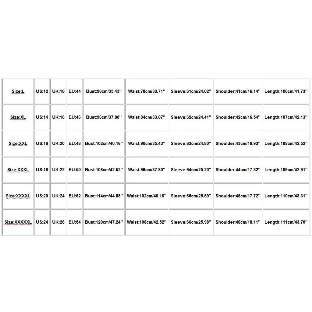 Что вы получаете: 1 шт. женское платьеРазмер США Великобритания ЕС Бюст Талия Рукав Плечо Длина L 12 16 44 90 см/35,43'' 78 см/30,71'' 61 см/24,02'' 41 см/16,14'' 106 см/41,73'' XL 14 18 46 96 см/37,80'' 84 см/33,07'' 62 см/24,41'' 42 см/16,54'' 107 см/42,13'' XXL 16 20 48 102 см/40,16'' 90 см/35,43'' 63 см/24,80'' 43 см/16,93'' 108 см/42,52'' XXXL 18 22 50 108 см/42,52'' 96 см/37,80'' 64 см/25,20'' 44 см/17,32'' 109 см/42,91'' XXXXL 20 24 52 114 см/44,88'' 102 см/40,16'' 65 см/25,59'' 45 см/17,72'' 110 см/43,31'' XXXXXL 24 26 54 120 см/47,24'' 108 см/42,52'' 66 см/25,98'' 46 см/18,11'' 111 см/43,70''