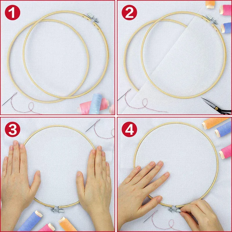 1. Ослабьте внешний винт, положите плоский Внутренний обруч, наденьте ткань на обруч, затем поместите внешний обруч на Внутренний обруч