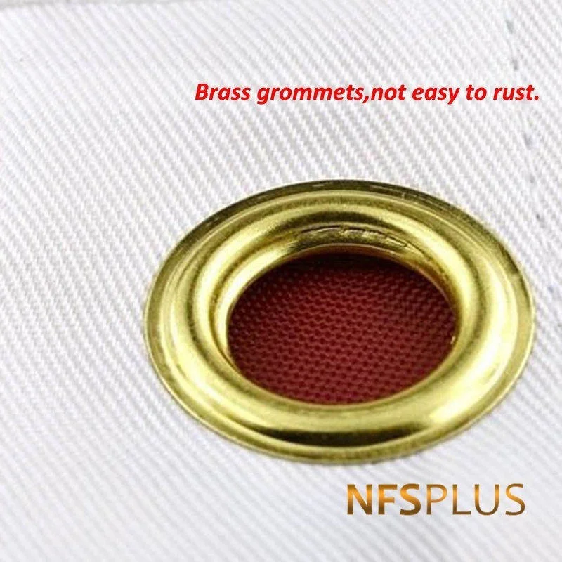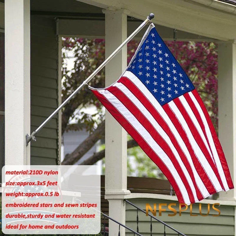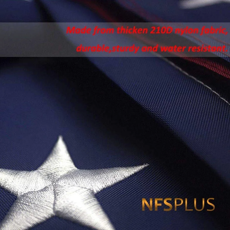 BRAND NFSPLUS® MATERIAL 210D nylon SIZE approx.3x5 (ft) = 90x150 (cm); approx.4x6 (ft) = 120x180 (cm); approx.5x8 (ft) = 150x240 (cm); approx.6x10 (ft) = 180x300 (cm). PACKAGE 1pc/polybag NOTICE please consider a little color difference and size error. FEATURE 1.made from thicken,durable and waterproof nylon,ideal for outdoors. 2.50 embroidered stars,13 sewn stripes and 2 brass grommets.