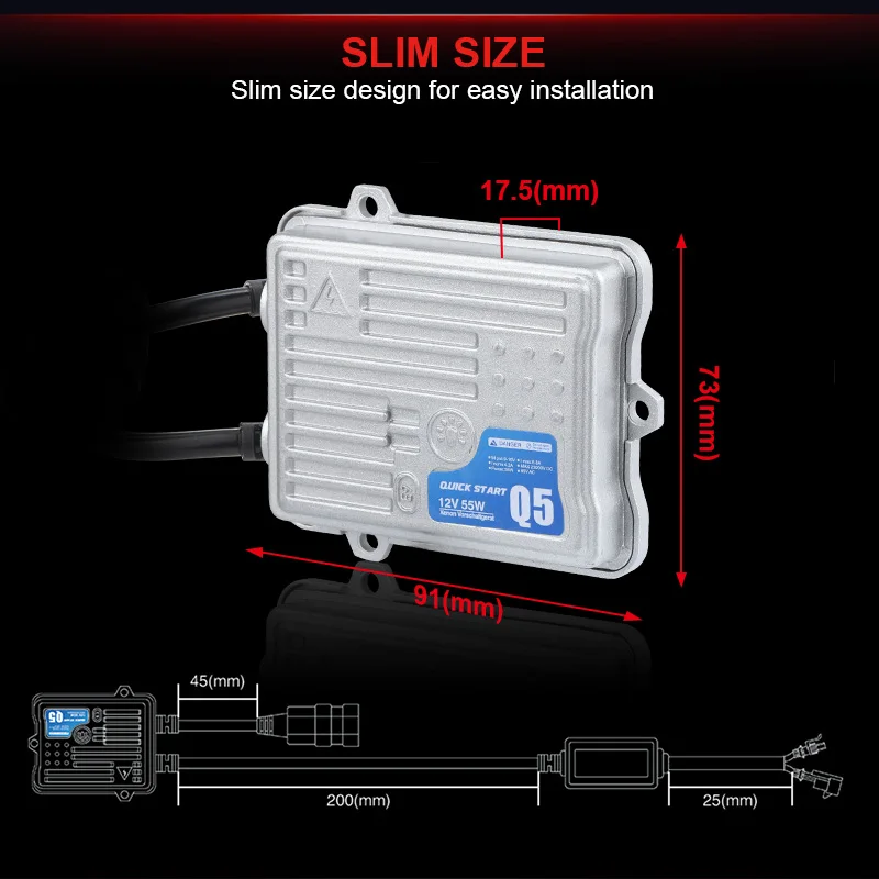 1 0.1s ignition, 1s light reach 20%, 4s light reach 80% 2 Aluminum case for water-proof and vibration resistant 3 Slim and easy for installation 4 Stable performance, with a SMR memorial microchip 5 The ballast can match all of the HID lamps. 6 Input voltage rage: AC 9V-16V 7 Rated voltage: 12V 8 Max. Start voltage: 23kV 9 Working temperature: -40 ~ 105C 10 Max. Input current: Less 10A C5 AC 12V 55W CANBUS Error Free 1 Input voltage rage: DC 9V-16V 2 Rated voltage: 12V 3 Max. Start voltage: 23kV 4 Working temperature: -40°C ~ 105°C 5 Max. Input current: Less 10A Q5 AC 12V 55W Fast Start 1 Input voltage rage: DC 9V-16V 2 Rated voltage: 12V 3 Max. Start voltage: 23kV 4 Working temperature: -40°C ~ 105°C 5 Max. Input current: Less 10A Package included: 2x HID Slim ballasts (70W 55W for your choice)