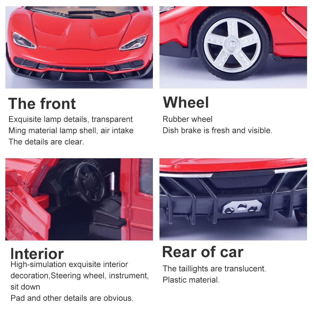 1. Высококачественная литая машина из сплава: с использованием высококачественного сплава цинка, органического литья под давлением, после 24 этапов отделки, полировки снова и снова, что делает автомобиль таким же деликатным, как ремесла!