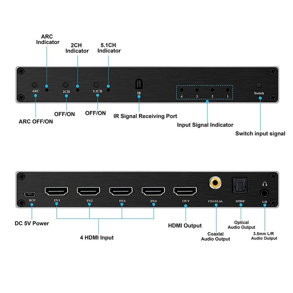 ★Поддержка ARC: поддержка s ARC (Канал возврата аудио), экстрактор звука с телевизора на звуковую панель или усилитель. Подключите порт HDMI(ARC) к этому переключателю, выходной порт HDMI с кабелем HDMI, затем используйте оптический/коаксиальный кабель для звуковой панели, динамика, домашнего кинотеатра, приемников A/V и т. д. Не искажают окружающий мир звука или видео (Примечание: 3,5 мм аудио Порты и разъёмы не sup Порты и разъёмы функции ARC)