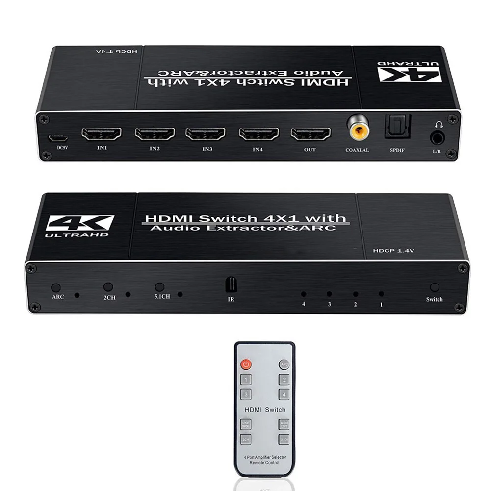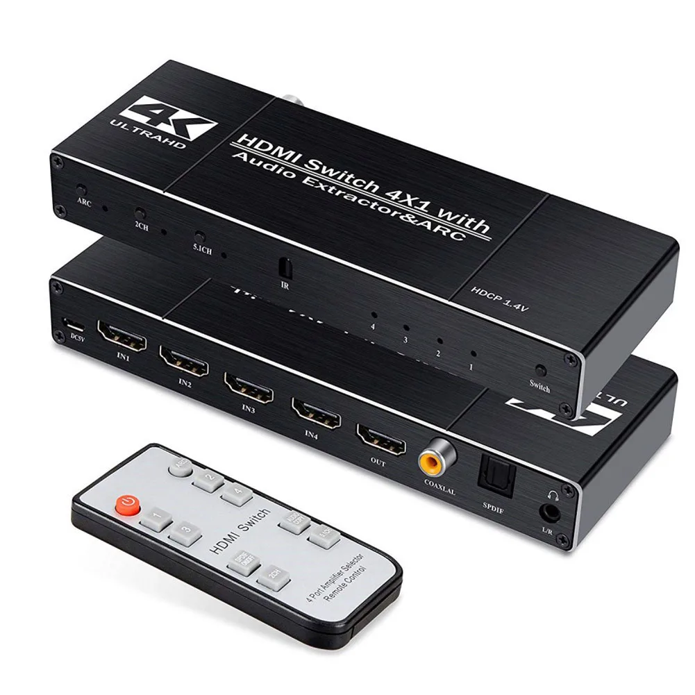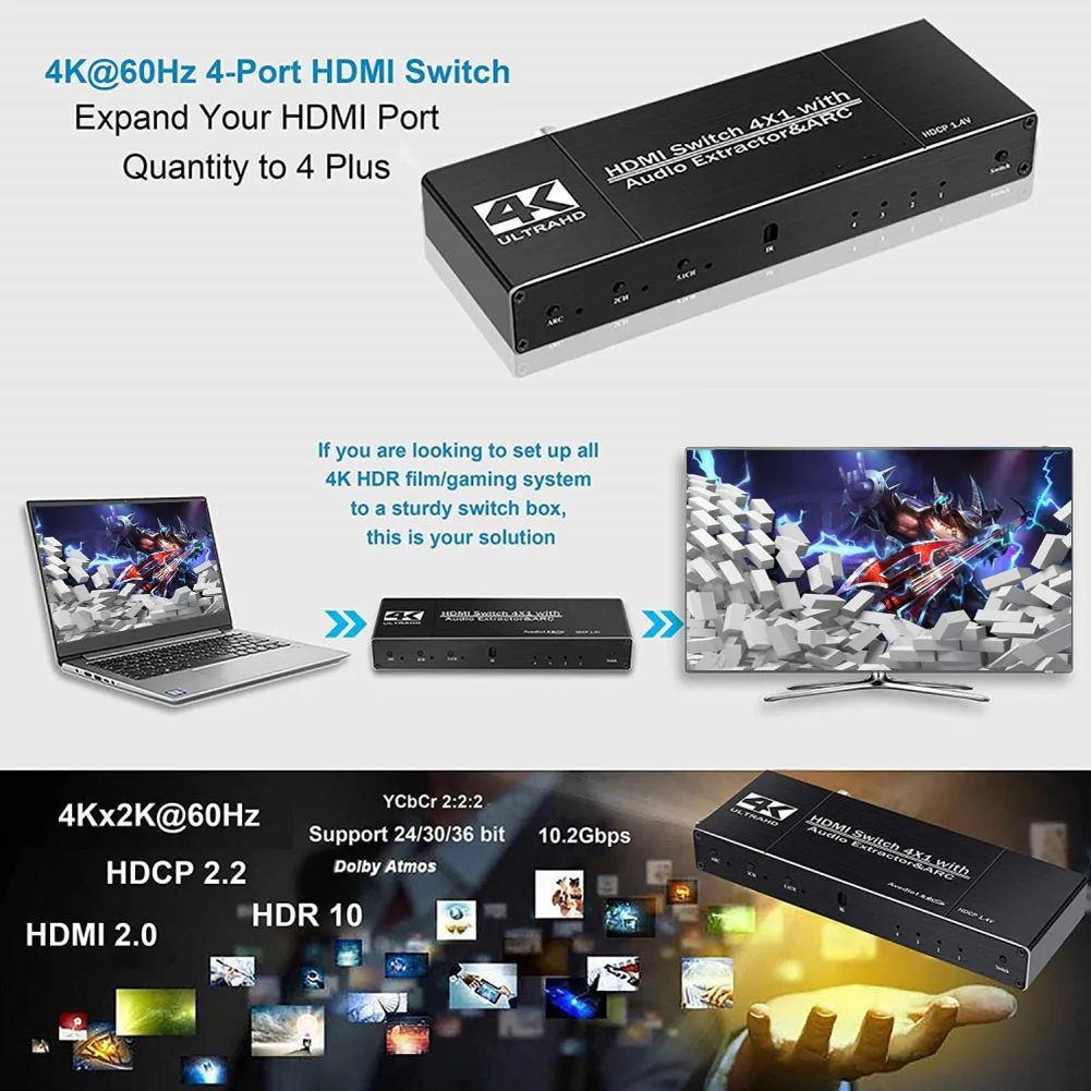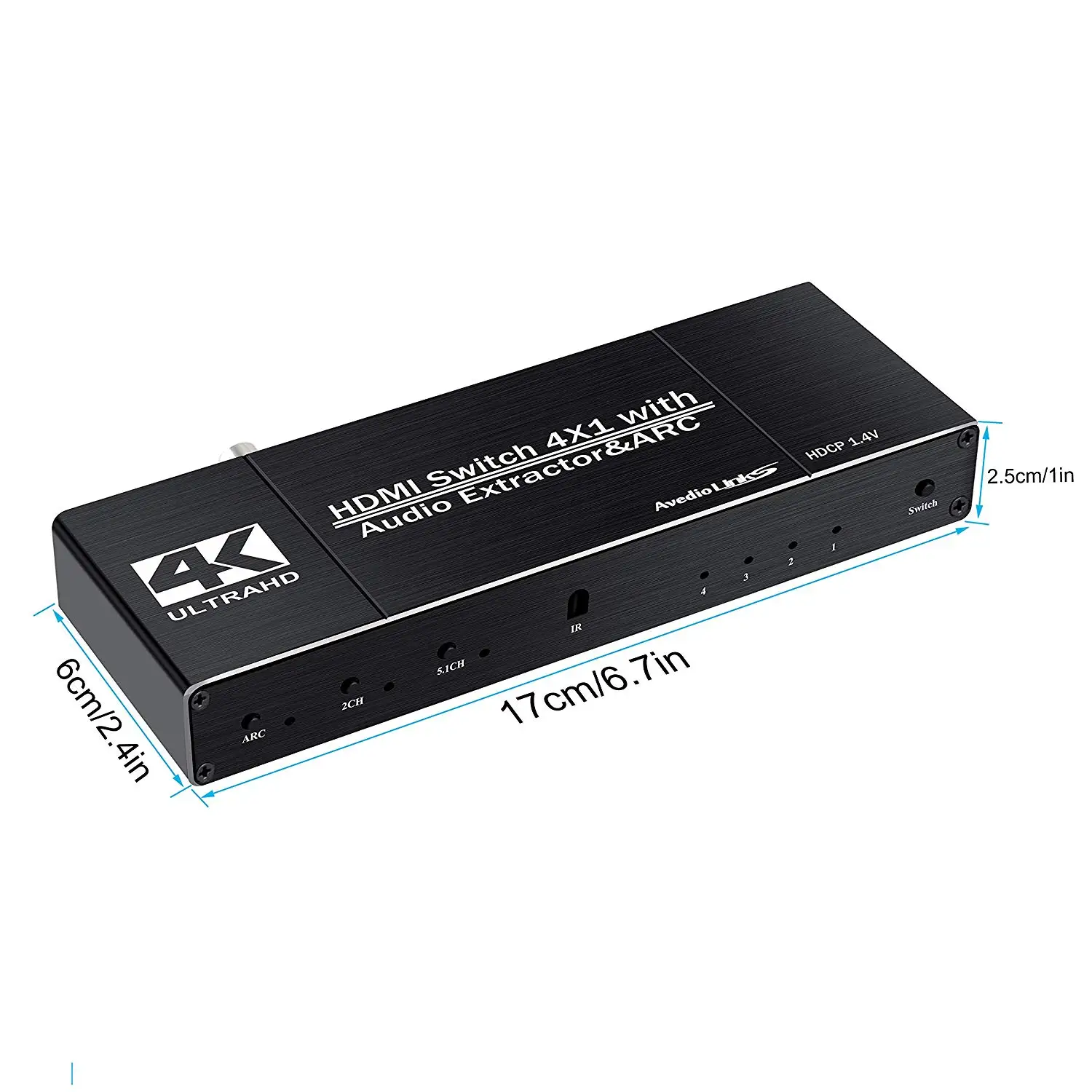 Новая версия 4 порта s HDMI переключатель: Этот 4-портовый переключатель HDMI sup порт s HDCP 1,4, HDMI2.0b,4K @ 60 Гц 4:4:4, RGB4:4:4,Full HD, UHD, глубокий цвет до 36 бит, также совместим с 4K при 30 Гц и 1080P. Максимальная пропускная способность 18,5 Гбит/с, Поддержка функция дуги, Дисплей более четким и более чувствительный, даст вам приятное ощущение домашнего Театр.