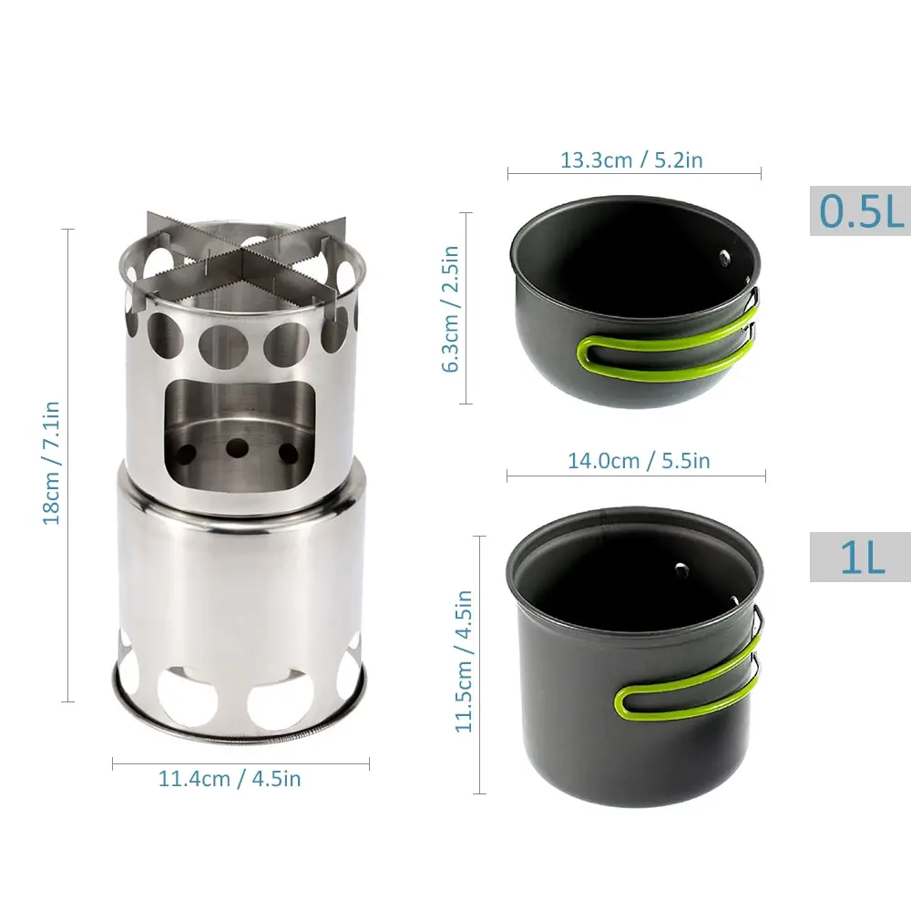 Это полный набор посуды для кемпинга, который включает в себя почти все необходимое для приготовления ваших походных обедов, таких как Складная дровяная плита, кастрюля, сковорода, пинцет для бревен, Беллоу, совок, миски, spoon and spork, все из которых упакованы в сетчатый мешок для хранения для удобного хранения и переноски. Отлично подходит для кемпинга, альпинизма, пикника, пеших прогулок, рыбалки, охоты и других видов активного отдыха.