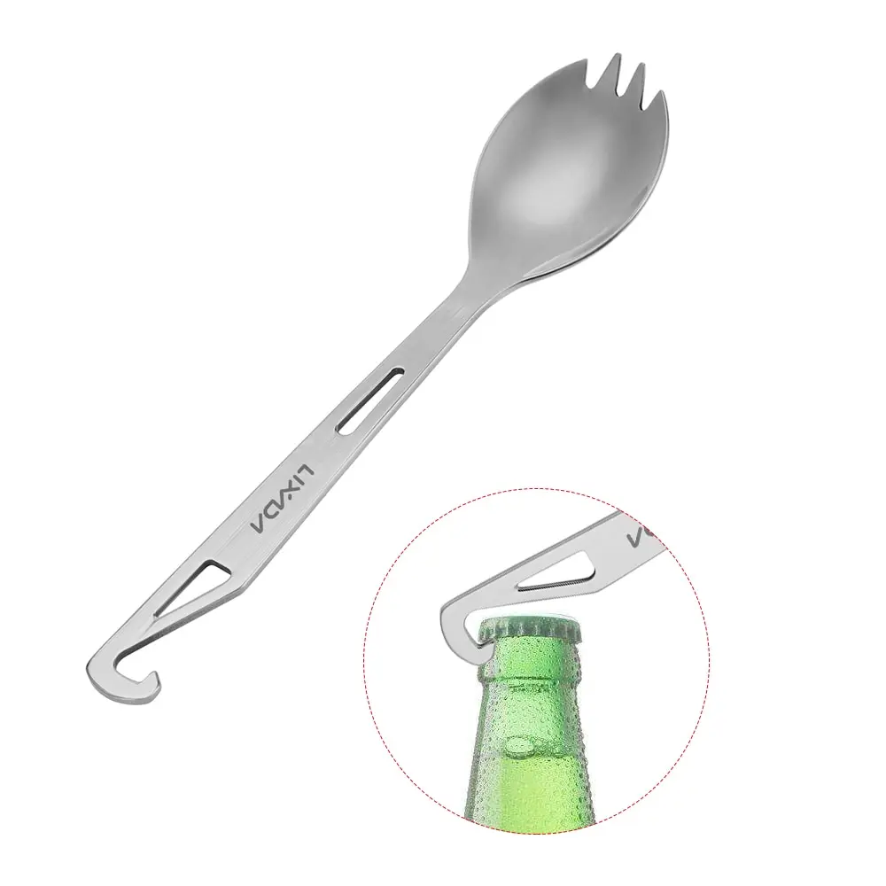 Этот spork объединяет функции вилки, ложки и открывания бутылок. Он изготовлен из нержавеющей стали, очень прочный в использовании, отлично подходит для кемпинга, пеших прогулок, альпинизма.