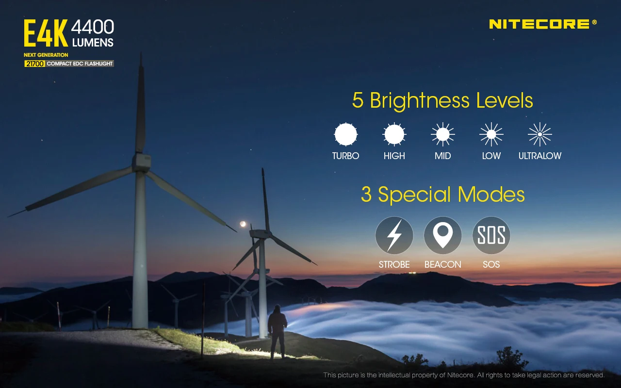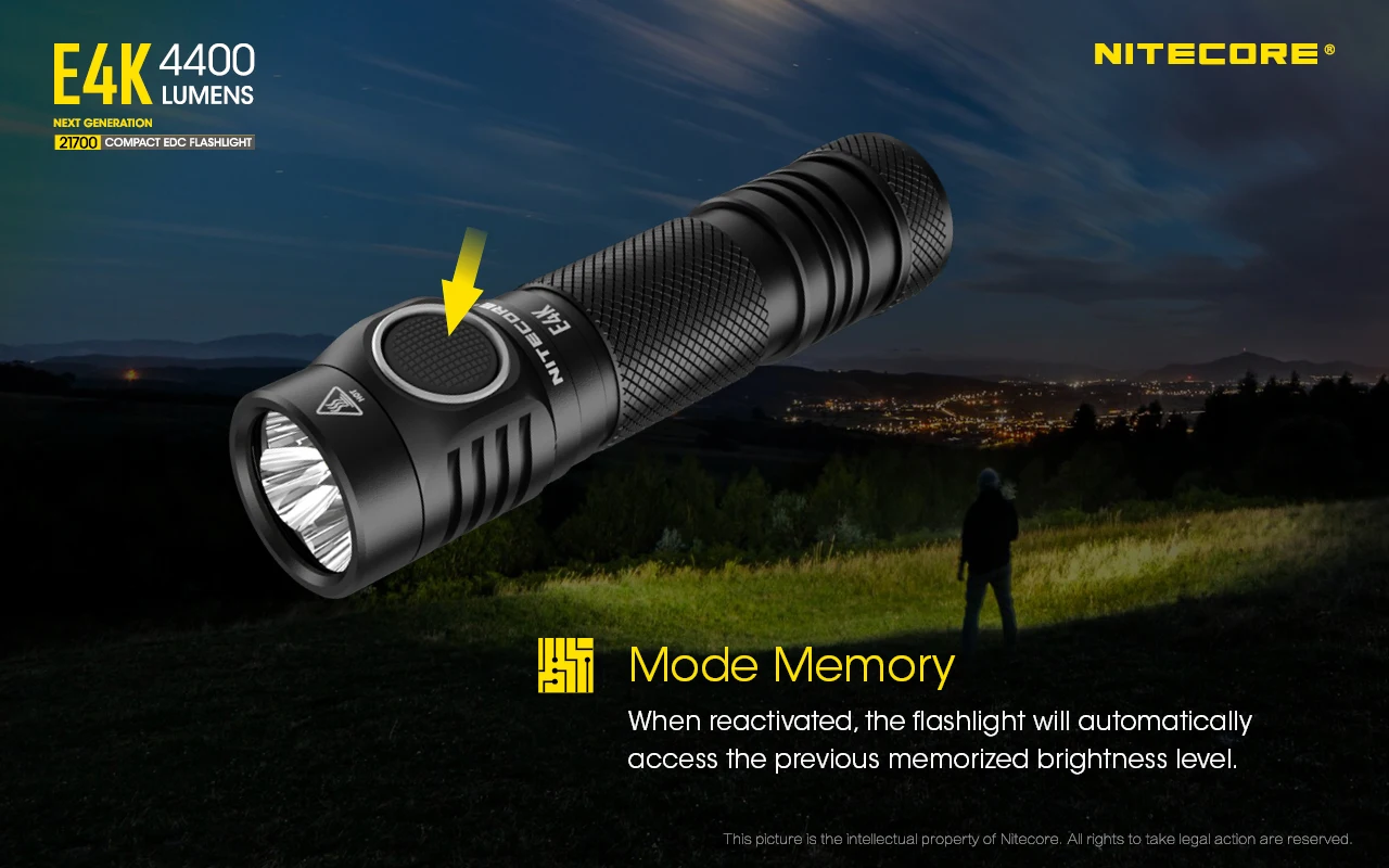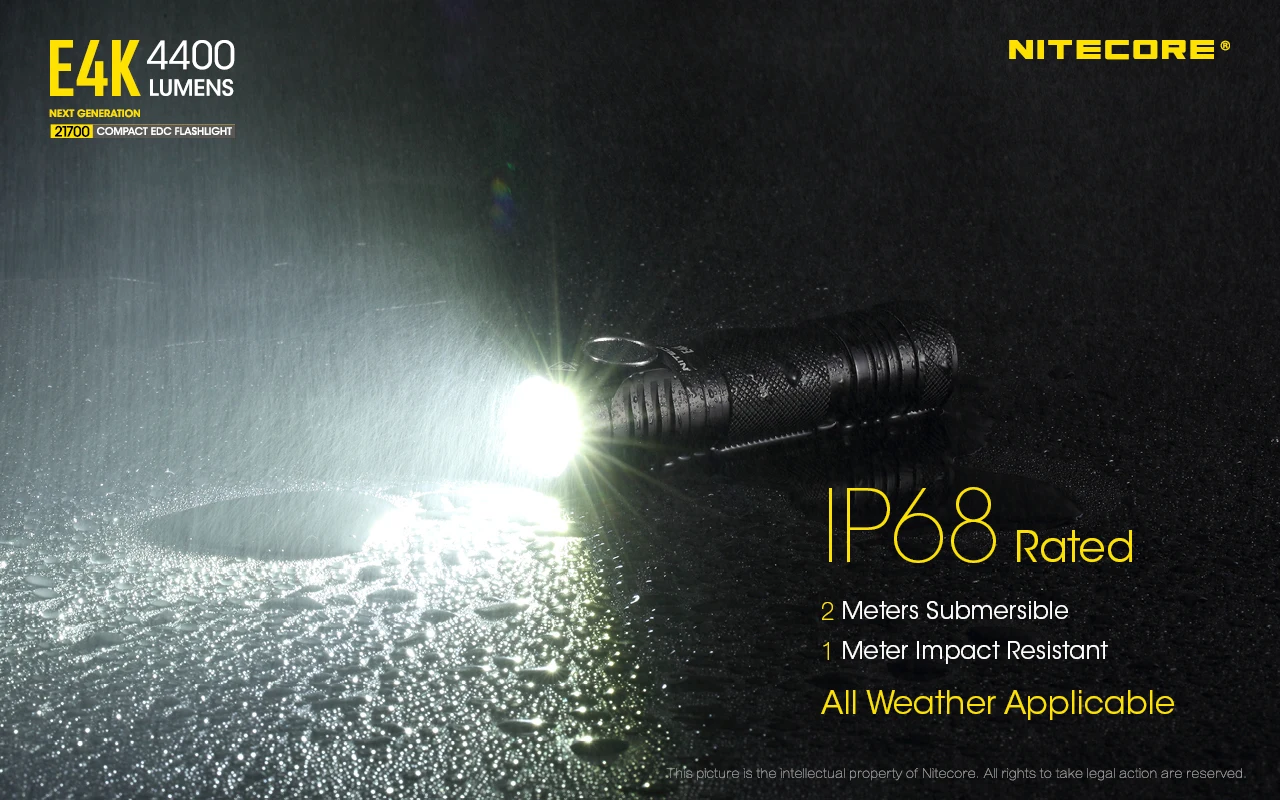 NITECORE E4K-самый мощный EDC фонарик, который у вас когда-либо был. При весе всего 2,82 унций и измерении менее 5 дюймов в длину E4K излучает 4400 люменов до 230 ярдов. Компактный Ультра легкий дизайн позволяет удобно держать в руке. Используйте прилагаемый двусторонний зажим, чтобы добавить свет к любому поясу, жилету или кармашку. С водонепроницаемостью IP68, ударостойкостью 1 метр и технологией Advanced Temperature (ATR) NITECORE E4K станет лучшим защитным компаньоном для активного отдыха.