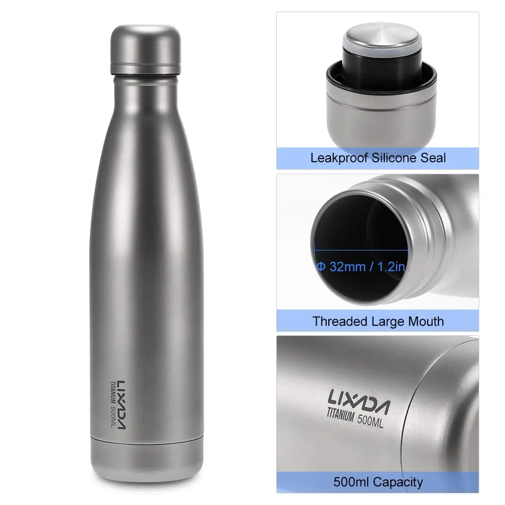 Эта бутылка для воды изготовлена из полного титана, который не оставляет запаха или вкуса для напитков. Двухстенные и вакуумные изолированные, чтобы держать напиток горячим/холодным в течение нескольких часов. Он запечатан силиконовой прокладкой на крышке, чтобы предотвратить утечку. Бутылка легкая и удобная для переноски в мешке, идеально подходит для кемпинга, пеших прогулок, альпинизма, велоспорта и повседневного использования.