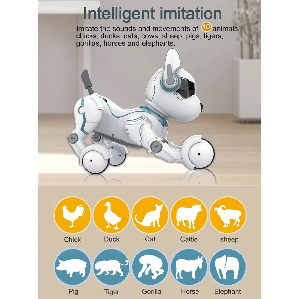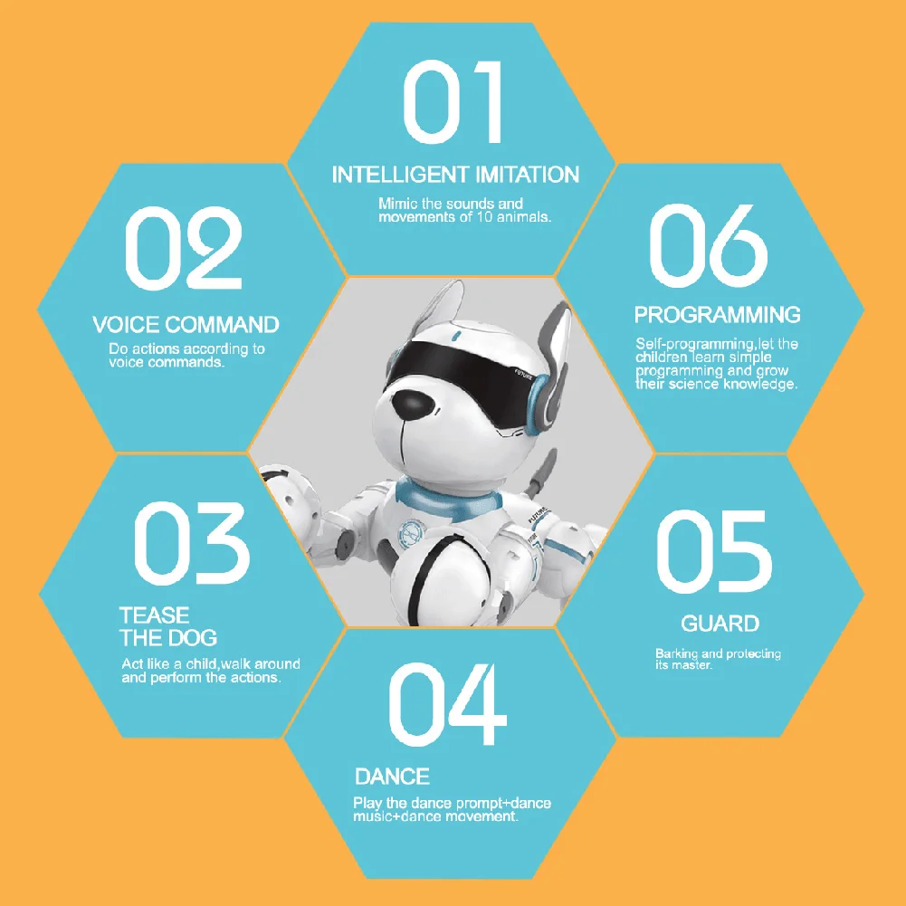 Функции: вперед, назад, влево и вправо, пение и танцы, обучение энциклопедии, интеллектуальная имитация, голосовое управление, Забавный собачий тизер, популярное научное Программирование