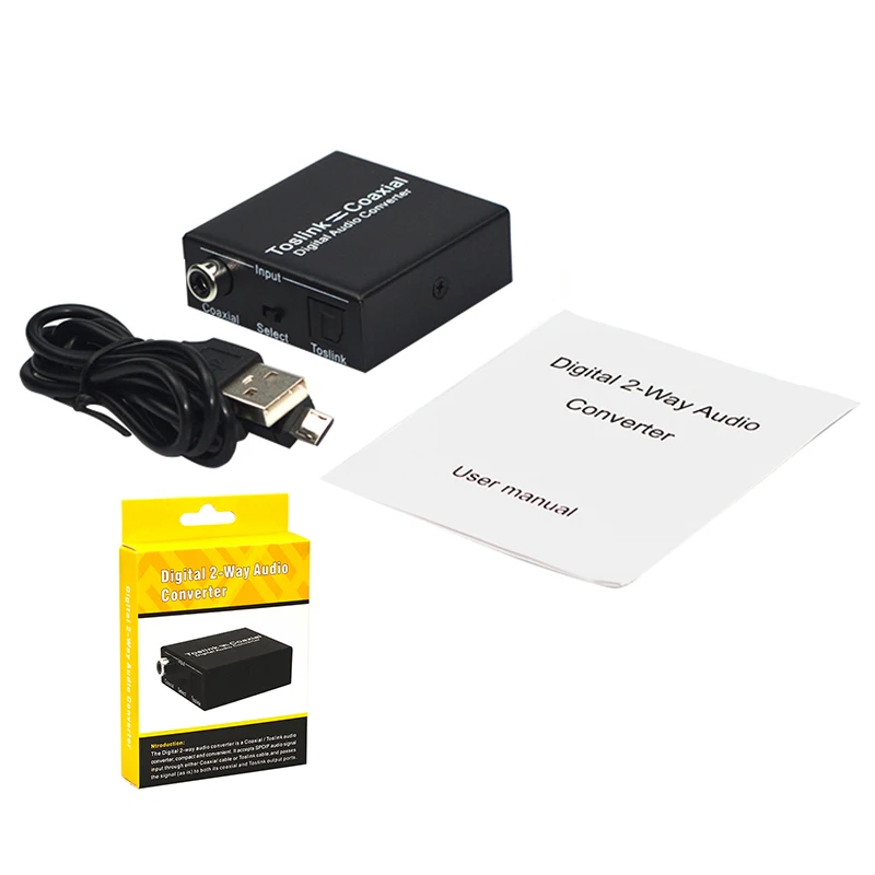 Цифровой 2-полосный аудио конвертер-это коаксиальный/Toslink аудио конвертер, компактный и удобный. Он принимает вход аудиосигнала S/PDIF через коаксиальный кабель или кабель Toslink и передает сигнал (как есть) как на его коаксиальные, так и на выходные порты Toslink. Благодаря встроенной функции усиления он также может служить ретранслятором звукового сигнала и увеличивать (двойное) расстояние передачи.