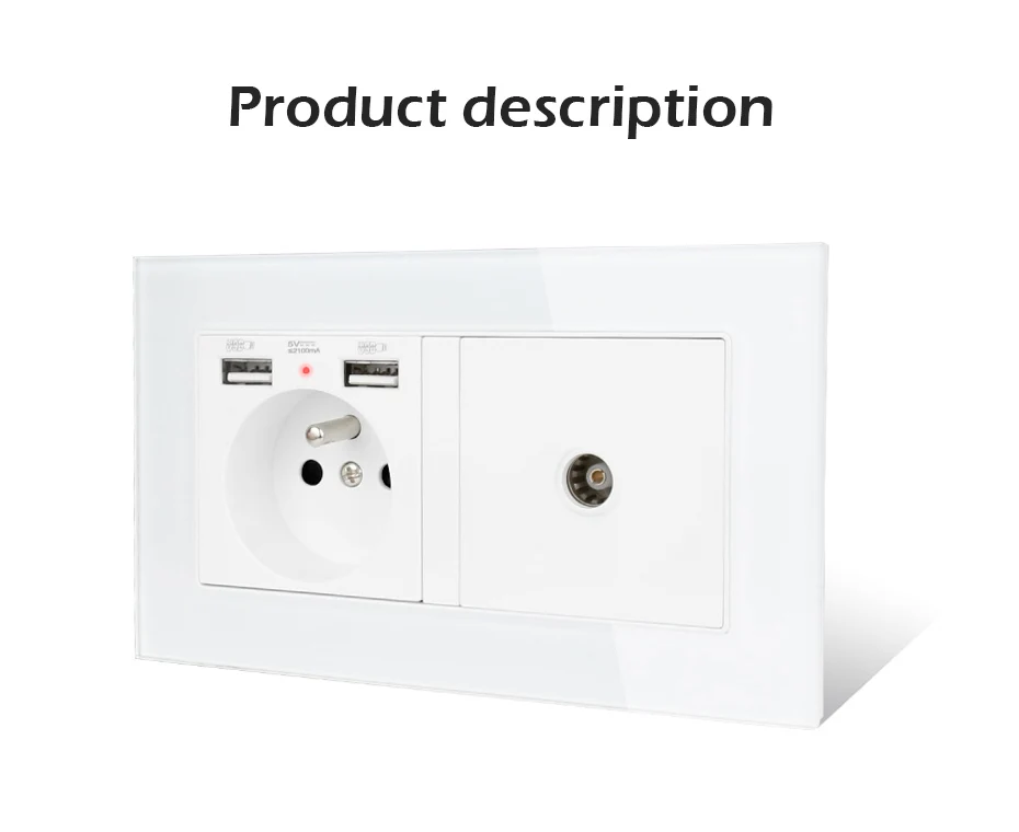 1. С 2-сторонней розеткой + двойной usb-розеткой + ТВ-модулем 2. Номинальное напряжение (ы): 100 ~ 250 В переменного тока/50 ~ 60 Гц 3. Номинальный ток: 16A 4. Обеспечение заземления: с заземлением 5. Степень защиты от электрического удара: с повышенной защитой 6. Тип клемм: винтовой 7. Размер: 146 мм x 86 мм 8. Цвет: белый, черный, золотой 9. Материал панели: роскошная хрустальная стеклянная панель 10. Стандарт розетки: французский стандарт
