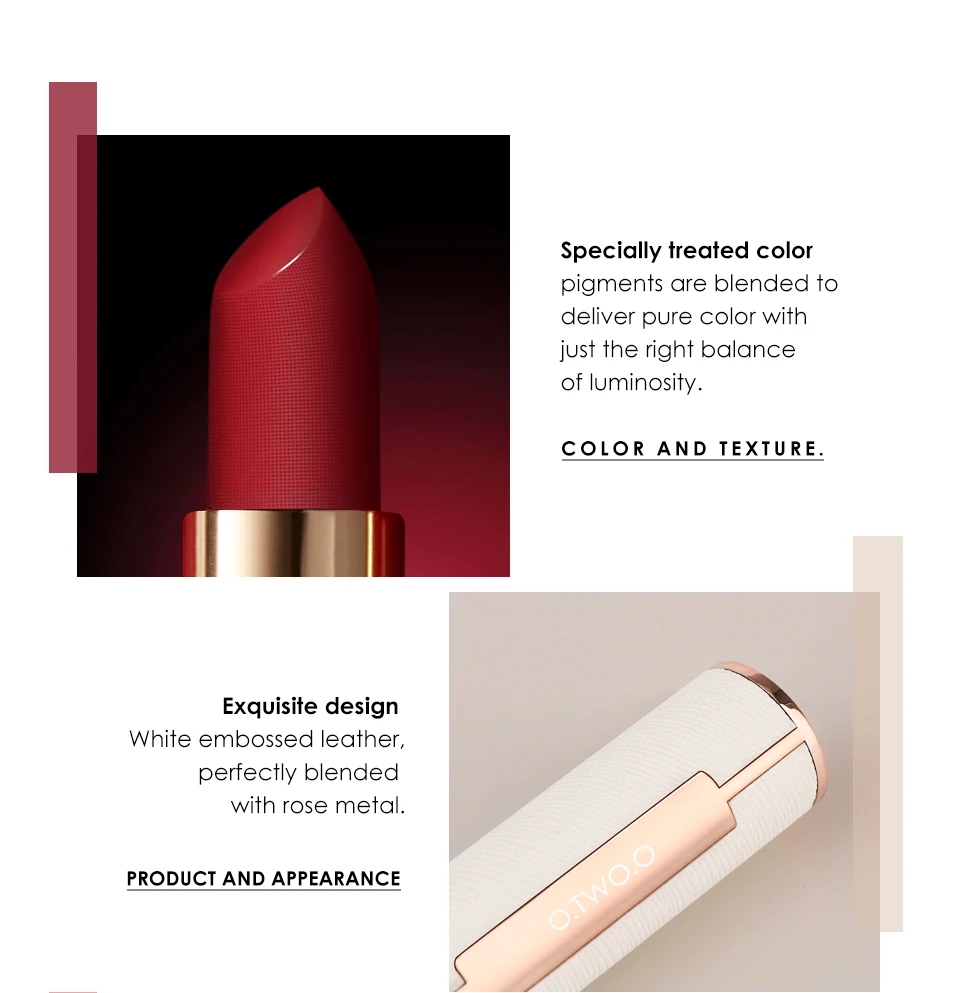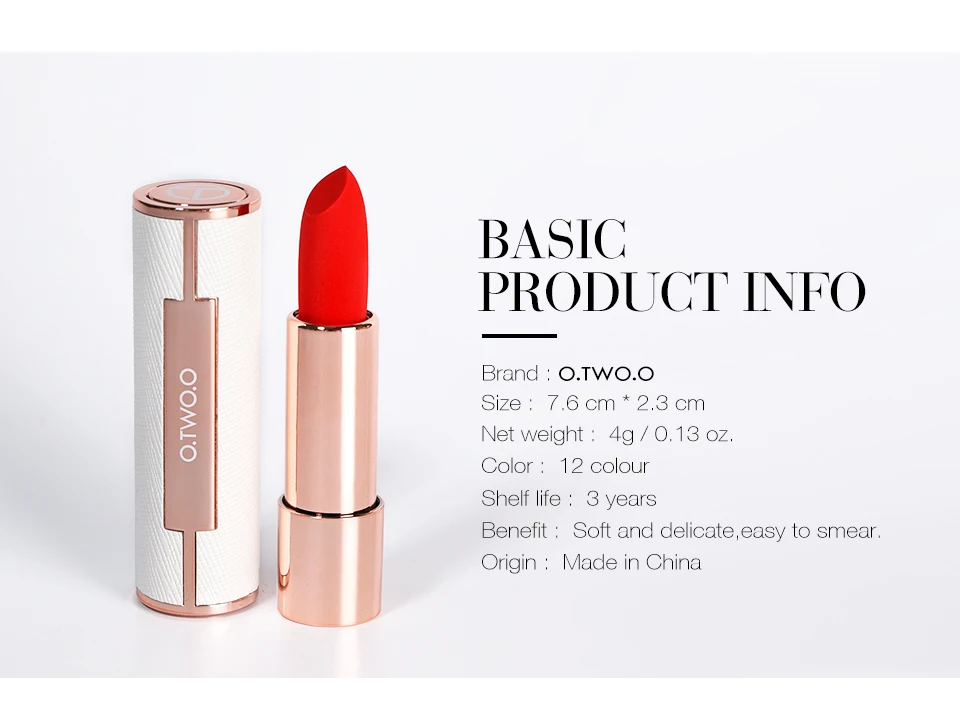 Это высококачественный продукт новой платиновой серии O.TWO.O. Внешний вид: Текстурированная белая кожа с розовым золотом придает элегантности помаде. Цвет: Есть 12 сенсационных цветов на выбор. Элегантный телесный, милый розовый, восторженные розы крови все доступны. Особенности: Это полуматовая помада, которая находится где-то между матовой и атласной. Сочетает в себе преимущества двух помад: 1. Долговечность, 2. Устойчивость, 3. Антипригарная чашка, 4. Увлажнение. Одна мягкая, приятная на ощупь формула; Восемь насыщенных оттенков. Это то, чего жаждал ваш поцелуй!
