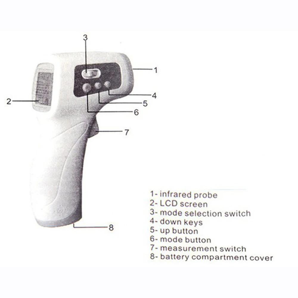Детали:-DM300 пистолет термометр-инфракрасная технология обнаружения, Бесконтактный, безопасный и здоровый-автоматическое отключение после 15 секунд холостого хода, энергосбережение и защита окружающей среды-функция преобразования температуры-Deg. c/Deg. f-0,5 секунды быстрое измерение-Питание от 2x1,5 AAA батарея (не включена) -С функцией включения/выключения звукового сигнала и точкой сигнализации-автоматически запоминайте последние 32 группы данных измерений-идеально подходит для ваших семей, особенно для ваших детей характеристики: Режим измерения: температура тела и температура поверхности-Диапазон измерения: режим температуры тела: 32-42,5 градусов. C Режим температуры объекта: 0-100 градусов. с-точность измерения 0-31,9 градусов. c: ± 2,0 град. C 32,0-35 градусов. c: ± 0,3 град. C 35,1-39,0 градусов. c: ± 0,2 град. C 39,1-42,9 градусов. c: ± 0,3 град. C 43,0-100 градусов. c: ± 2,0 град. с-время измерения: 0,5 секунды-Расстояние срабатывания: 5-8 см-точность отображения: 0,1 град. c-разрешение: ± 0,1 град. C инструкции: функциональные кнопки-Кнопка питания для обнаружения и включения функций-корпус/объект: режим преобразования нажмите кнопку режим для преобразования температурного режима тела/режим поверхности-набор/+/-питание на термометре, Нажмите кнопку Set в течение 2 секунд, ЖК-дисплей будет отображать F1 (преобразование температурного блока)-F2 (Настройка температурного будильника)-F3 (настройка температуры)-F4 (звуковой сигнал вкл/выкл), и нажмите кнопку +/-для настройки Функции: Многофункциональность Материал: АБС-пластик, электронные компоненты Повод: офис, школа, дом, автомобиль Цвет: белый Размер продукта (Д x Ш x В): 15x8,5x4,2 см/5,90x3,34x1,65 дюйма Размер упаковки (Д x Ш x В): 18x11x7 см/7,07x4,32x2,75 дюймов Комплектация: 1 x DM300 инфракрасный термометр пистолет бесконтактный прибор для измерения температуры, 1 x руководство пользователя на английском языке