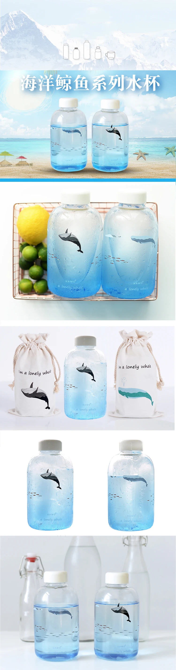 Креативная стеклянная бутылка для воды с градиентным цветом Кита, милая чашка с морскими животными, удобная тканевая сумка, 600 мл, походная Спортивная походная посуда