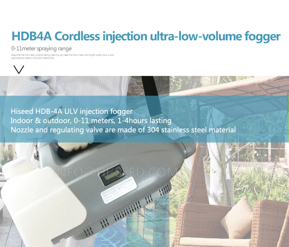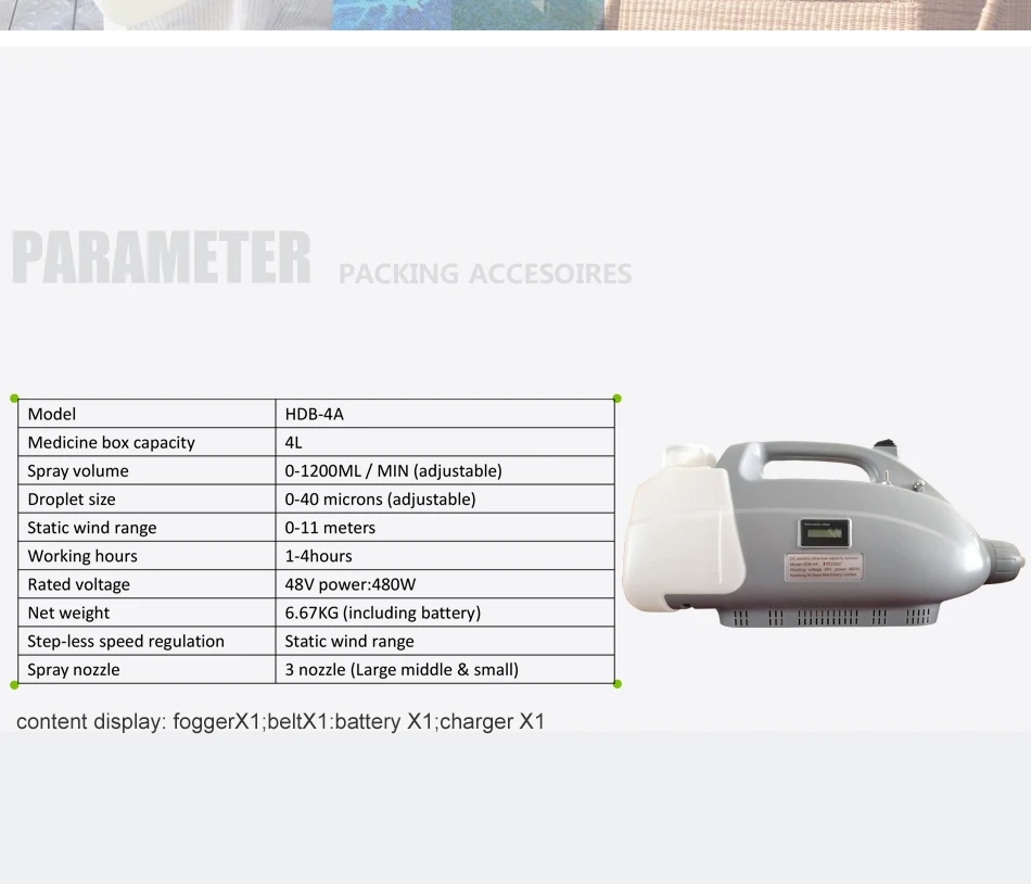 Модель HDB-4A Емкость коробки для лекарств 4L Объем распыления 0-980 мл/мин Размер капель 0-50 мкм (регулируется) Диапазон статического ветра 0-11 метров Время работы 1-4 часа Номинальное напряжение 48 В мощность: 480 Вт Вес нетто 3,5 кг (включая батарею) Бесступенчатое регулирование скорости статического ветра Сопло-распылитель 3 сопла (большой средний и маленький) Особенности, Беспроводной и портативный Долгие рабочие часы Дальний диапазон распыления инъекций Плавное регулирование скорости Отрегулируйте регулирующий клапан для контроля размера частиц в соответствии с фактическими потребностями Простой в использовании переключатель ручки Сильная подача воздуха, быстрая диффузия, стабильное распыление Во-первых, низкий звук, снижение рабочего шума, бесшумное увлажнение Во-вторых, емкость составляет пять литров. В-третьих, Материал жесткий, с использованием инженерных материалов для продления срока службы, В-четвертых, устойчивы к падению и износу, Большое количество тумана, Система распыления-это высокая мощность, сильный и мощный, регулируемый размер, увлажнение культур, удобный и экономичный