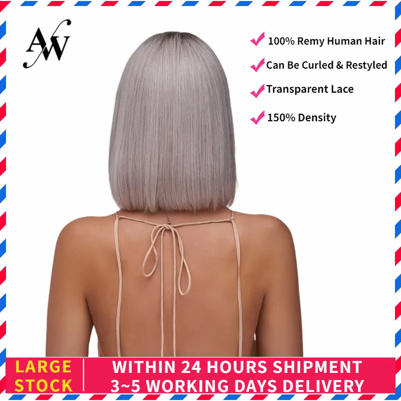 AW 10 ''12'' Серебряный прямой Боб кружевной передний парик прозрачный предварительно выщипанный волос Половина Кружева Remy волосы парик для женщин 150% Плотность