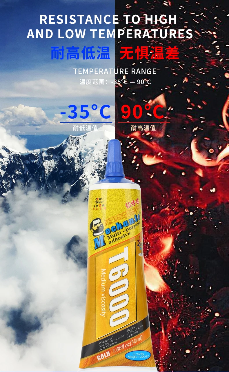 Технические характеристики изделия: -- Бренд: Mechanic. -- Материал: эпоксидная смола. -- Тип: жидкий клей. -- Цвет: золотистый -- Размер: 50 мл. -Модель: T6000. -- Подходит для стекла, пластика, акриловые стразы, PE , PP, PVC, ABS, Ремонт сенсорного экрана.