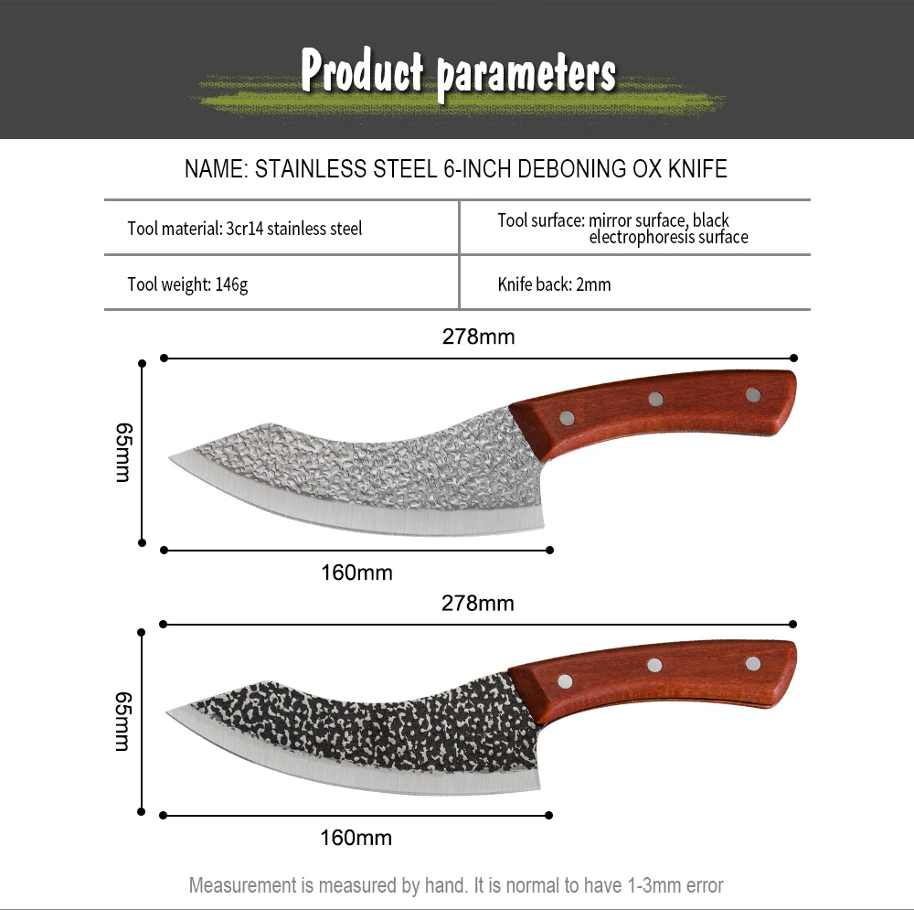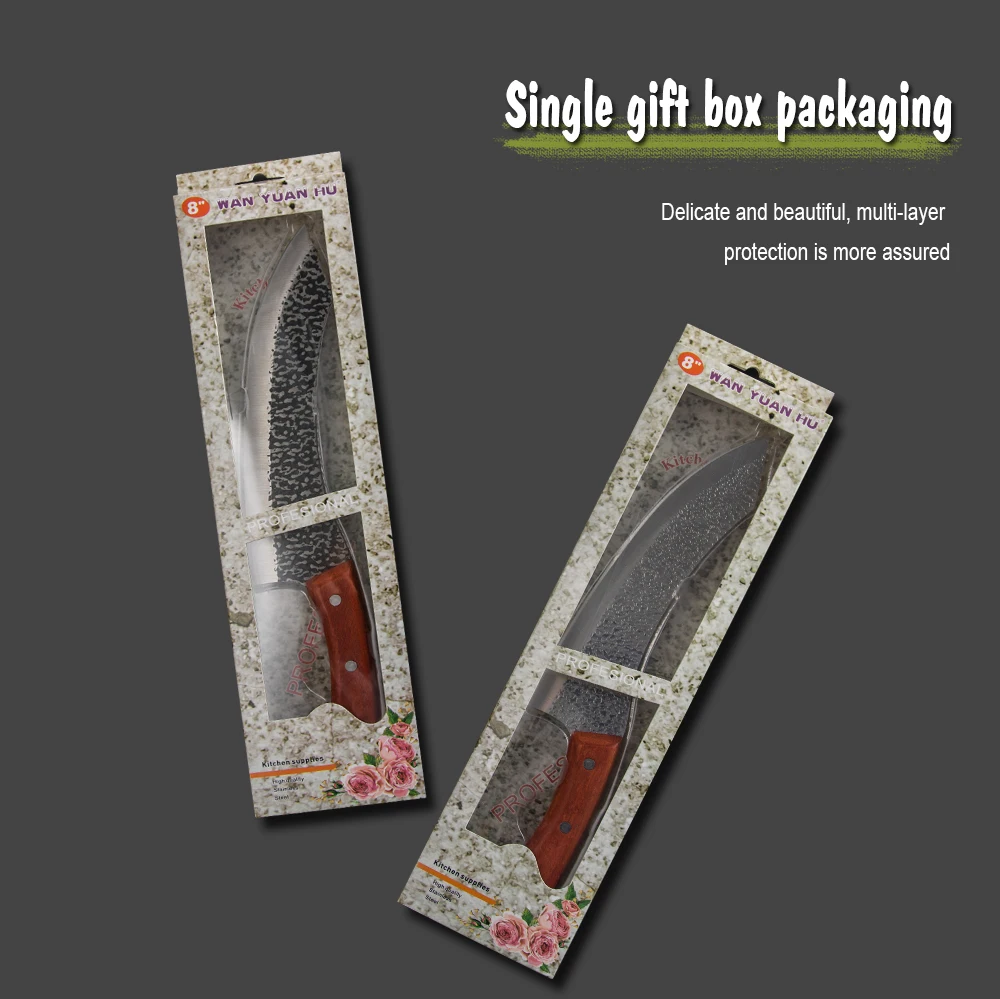 Материал ножа: кованая высокоуглеродистая плакированная сталь Посылка включает в себя: Как показано на картинке Особенности: Из-за закалки навыков, сделанных опытными работниками и уникальной технологии формирования с различными методами нагрева, равновесие между жесткостью и прочностью таких ножей является гарантией, чтобы сделать их более прочными. Внимание: -После того, как вы используете нож, сразу же высушите краску сухой тканью -Для безопасности, Не хватайте нож за лезвие при падении -Не Тестируйте остроту ножа на пальце или любой другой части тела -Храните нож вдали от детей, когда он не используется -Никогда не позволяйте детям использовать или обрабатывать нож