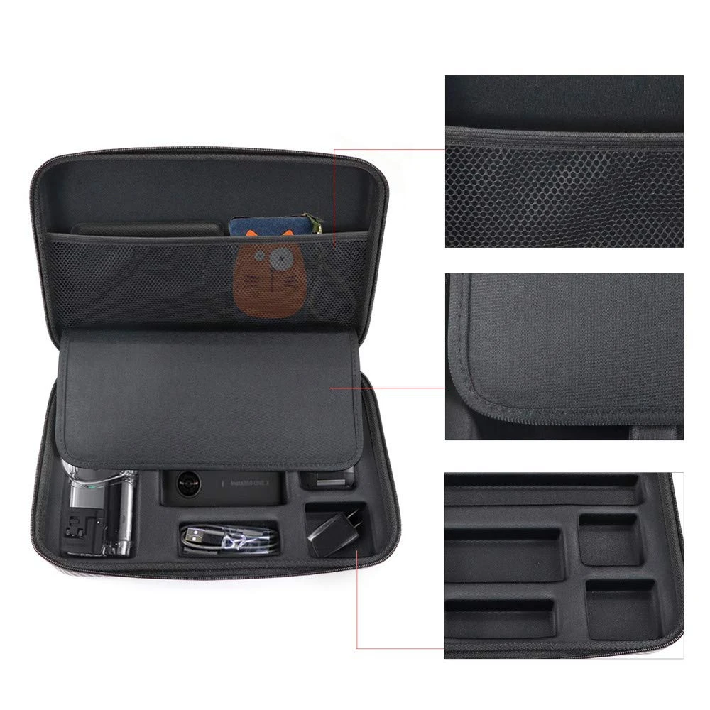 Разработанный специально для экшн-камеры Insta 360 ONE X 360, он также может поставить зарядное устройство, штепсельную вилку зарядного устройства, кабель для передачи данных, защитный чехол, мобильный источник питания, ящик для хранения и т. д.