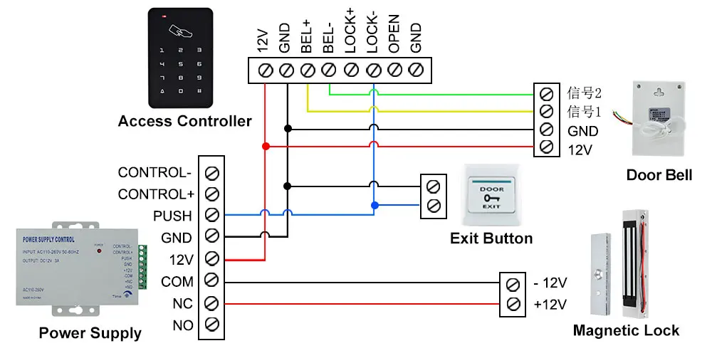 Эта схема проводки предназначена только для ознакомительных целей. Блок питания, кнопка выхода контроллера доступа и дверной звонок, который отображается на рисунке ниже, не включены в посылка. Если они вам нужны, вы должны приобрести их дополнительно.