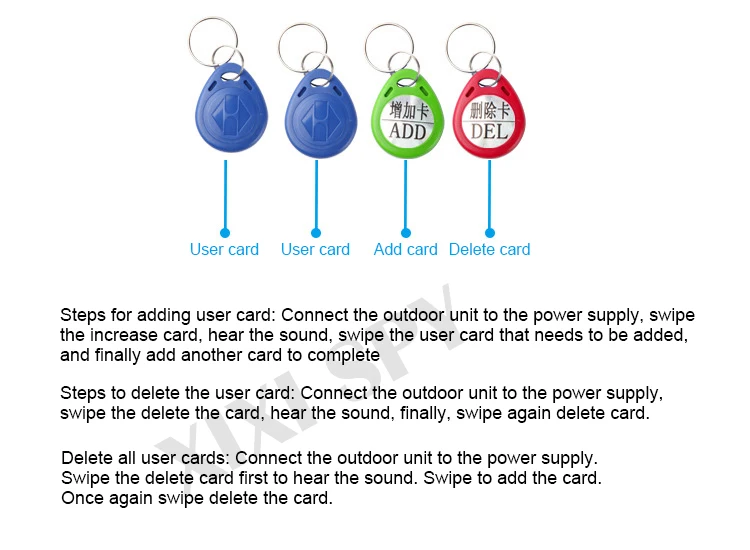 Пользовательские карты Добавьте карту Удалить карту Шаги для добавления пользовательской карты: подключите внешний блок к источнику питания, проведите по увеличенной карте, услышите звук, проведите по карте пользователя, которая должна быть добавлена, и, наконец, добавьте другую карту для завершения Шаги по удалению пользовательской карты: подключите внешний блок к источнику питания, проведите удалением карты, услышите звук, наконец, проведите пальцем снова удалите карту. Удалите все пользовательские карты: подключите внешний блок к источнику питания. Сначала проведите по удаленной карте, чтобы услышать звук. Проведите пальцем, чтобы добавить карту. Еще раз проведите пальцем удалите карту.