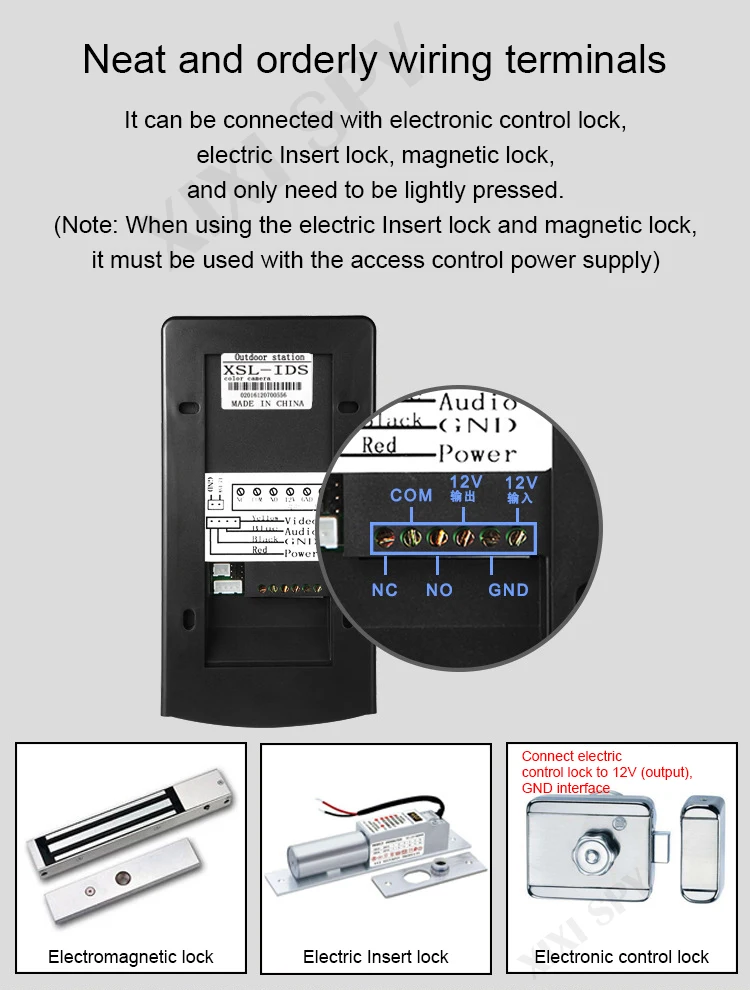Он может быть подключен к электронному замку управления, электрическому замку вставки, магнитному замку, и его нужно только слегка прижать. (Примечание: При использовании электрического замка вставки и магнитного замка, он должен использоваться с источник питания с контролем доступа) Электромагнитный замок Электрический вставить Стопорную Электронный блок управления Подключите электрический замок управления к 12 В (выход), интерфейс GND