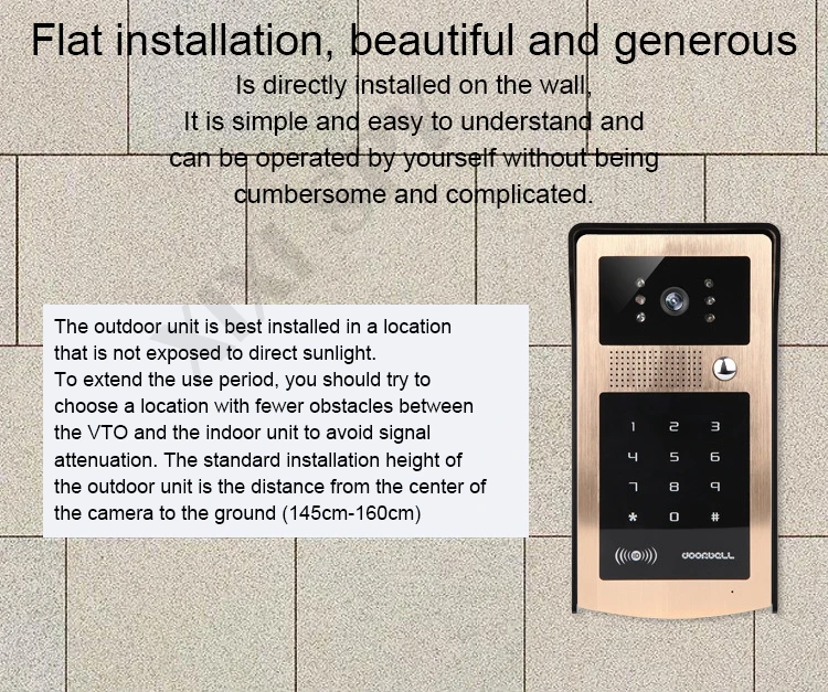Устанавливается непосредственно на стену, это просто и легко понять и может управляться самостоятельно, не будучи громоздким и сложным. Внешний блок лучше всего установить в месте, которое не подвержено воздействию прямых солнечных лучей. Чтобы продлить срок использования, вы должны попробовать выбрать место с меньшим количеством препятствий между VTO и внутренним блоком, чтобы избежать затухания сигнала. Стандартная высота установки наружного устройства-расстояние от центра камеры до земли (145-160 см)