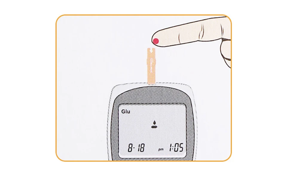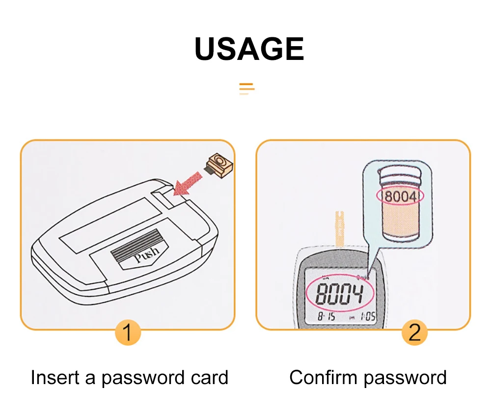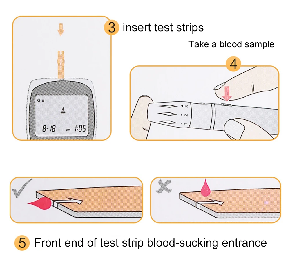 1. Вставьте пароль 2. Подтвердите пароль 3. Вставьте тест-полоски 4. Возьмите образец крови 5. Передний конец тест-полоски всасывания крови вход