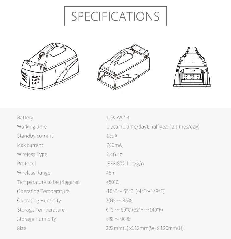 Тип батареи: 1,5 В AA Размер × 4 (6 в) Потребляемая мощность: 0,6 Вт Ток в режиме ожидания: 1uA Радиочастота: 2,4 ГГц беспроводное расстояние: 45 м Максимальный ток: 100 мА (при крысах) Рабочая температура: 0-40 ℃ Температура хранения: 0-60 ℃ Размер (Д x Ш x В): 222 мм x 112 мм x 120 мм Срок службы батареи: убивает до 40 крыс в наборе батарей Убивает одну крысу Высоковольтный шок убивает грызунов Отправить push уведомление на мобильный телефон, когда убивает крысу Используйте с осторожностью вокруг детей и домашних животных Приложение указывает на то, что батарея не работает.