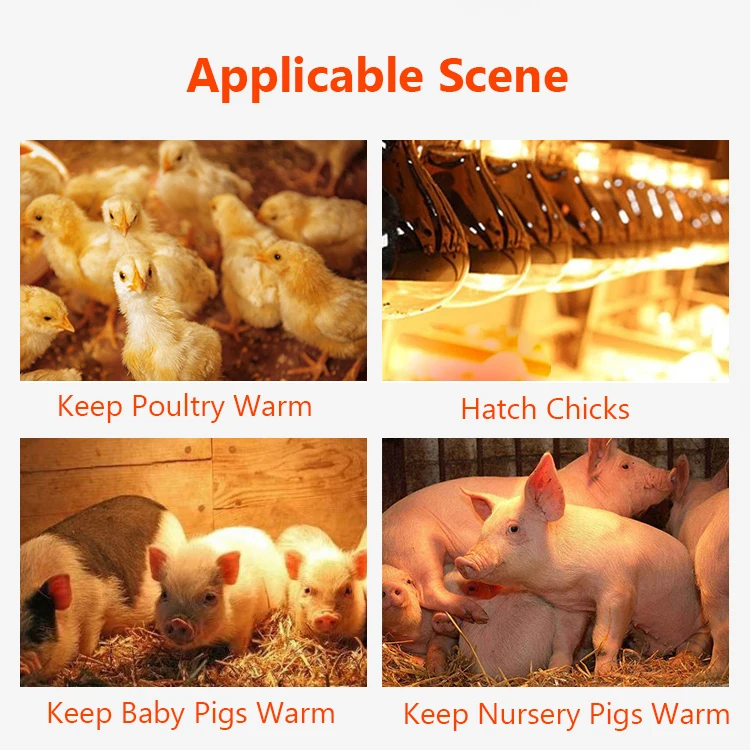 Лампа используется с короткой волной Красного инфракрасного излучения, глубокого нагрева, быстрой скоростью нагрева и низкой яркостью, без стимуляции, без вреда для глаз и эффективного предотвращения поноса свиней.