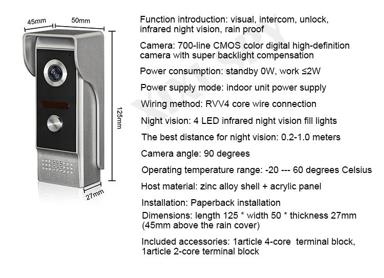 Описание функции: визуальный, домофон, разблокировка, инфракрасное ночное видение, защита от дождя Камера: 700-line CMOS цветная цифровая камера высокой четкости с высокой компенсацией подсветки Потребляемая мощность: в режиме ожидания 0 Вт, работа ≤ 2 Вт Режим питания: внутренний блок питания Метод проводки: соединение провода с сердечником RVV4 Ночное видение: 4 светодиодный инфракрасный ночного видения Лучшее расстояние для ночного видения: 0,2-1,0 метров Угол обзора камеры: 90 градусов Диапазон рабочих температур: -20 --- 60 градусов Цельсия Материал хоста: корпус из цинкового сплава + акриловая панель Установка: в мягкой обложке Установка Размеры: Длина 125 * ширина 50 * толщина 27 мм (45 мм над дождевиком) Вес: 0,35 кг Аксессуары в комплекте: 1 артикул 4-х ядерный терминальный блок, 1 артикул 2-ядерный терминальный блок