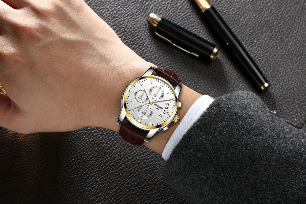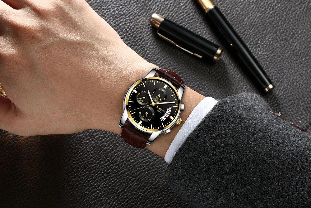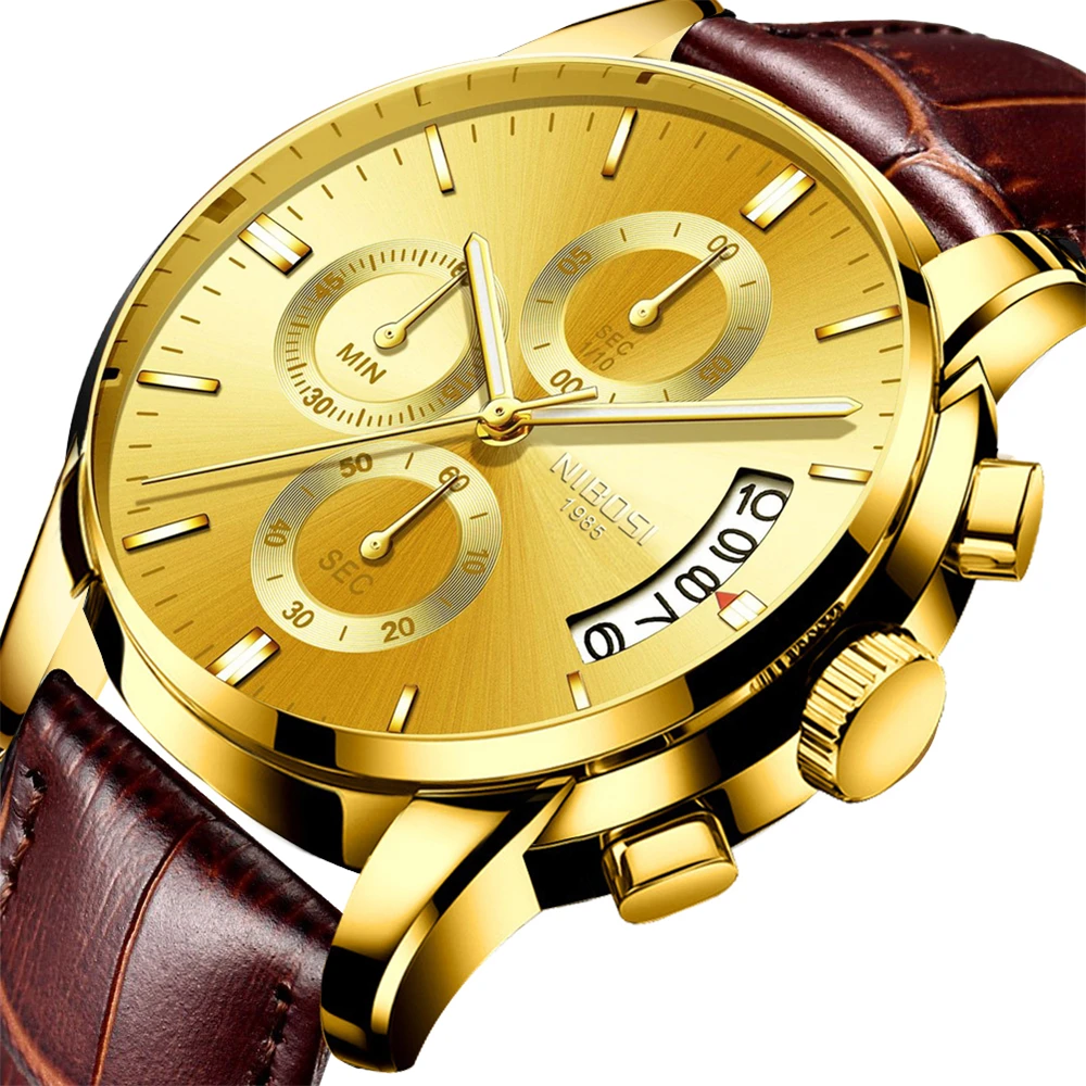 Часы наручные NIBOSI Мужские кварцевые, брендовые Роскошные спортивные водонепроницаемые в стиле милитари, с кожаным ремешком