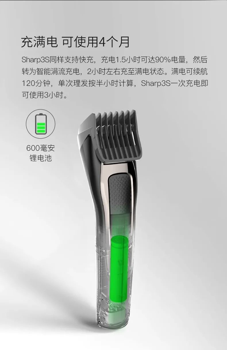 Бренд: ENCHENМодель:Шарп 3сЦвет: черныйВес: 400 гРазмер: 45x180 ммВремя зарядки: 1,5-2 чГоловка бритвы моющаяся, но не корпус машины!Посылка входит:1 x электрическая машинка для стрижки волос2 гребня1 x USB-кабель