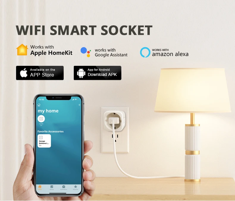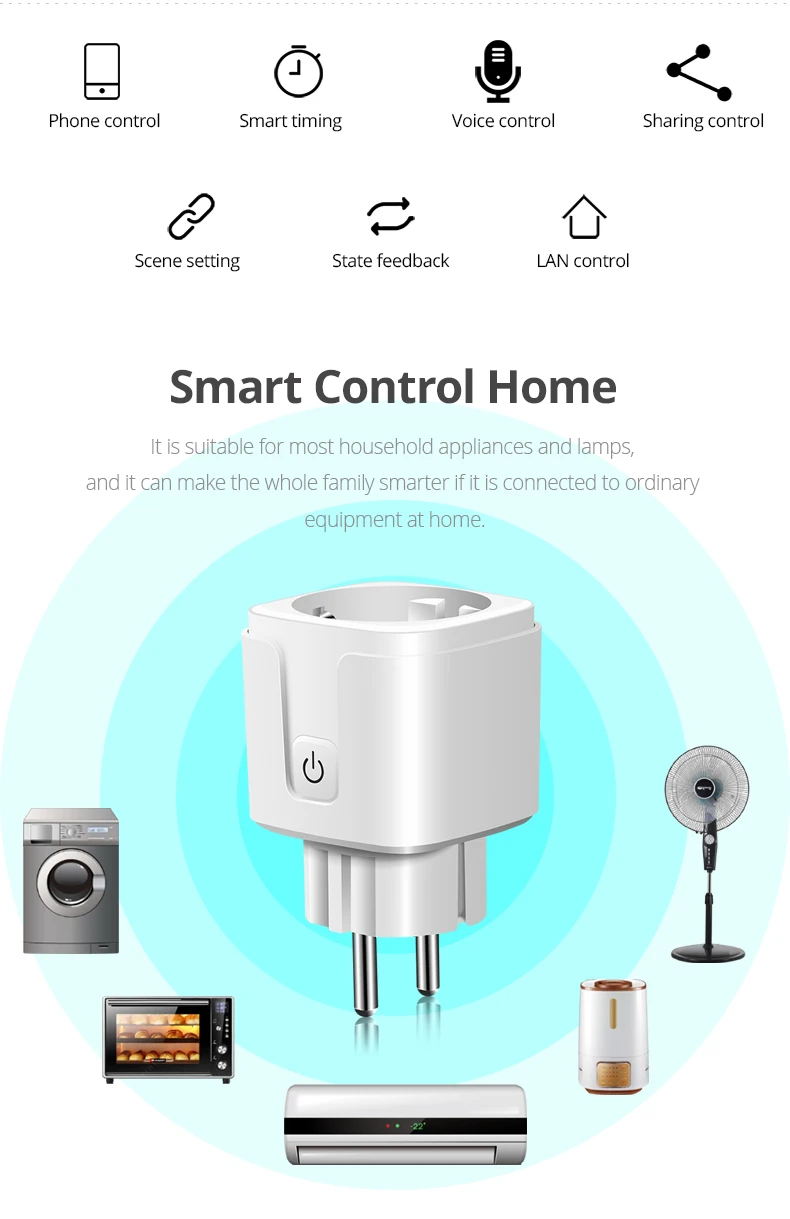Умная розетка Управление из любого места: поверните электроники времени включения и выключения ваши умные дома устройства из любого места с вашим смартфоном, используя чехол приложение, независимо от того, являетесь ли вы у себя дома, в офисе или на отдыхе.