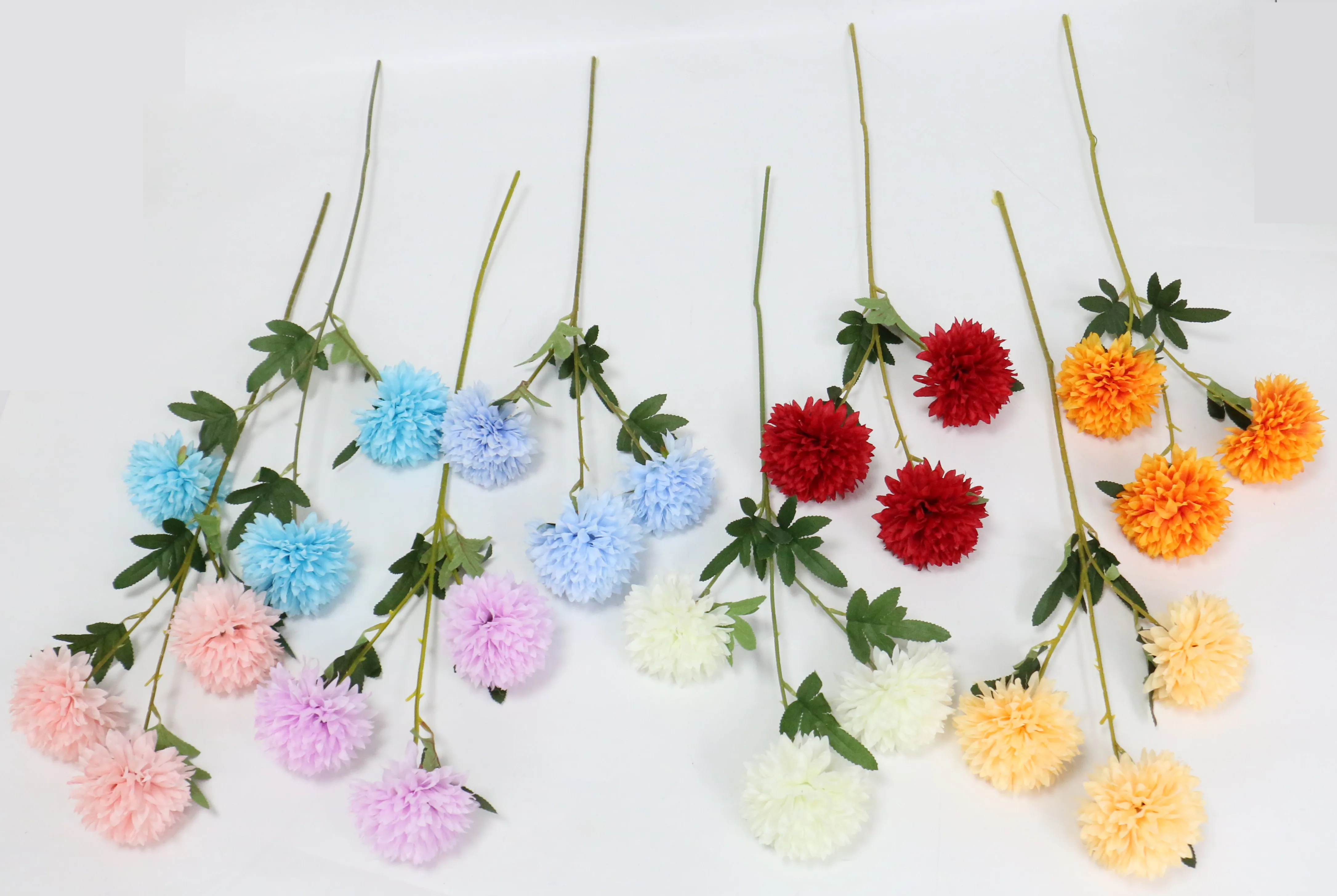 Feature: Name:3 heads dandelionsMaterial:silk.Color:pink,white,yellow,purple,light blue,red,orange,blue.Size:total length:65cm/25.59inch.1 pc have 3 heads,Single flower head diameter:7cm/2.76inch.