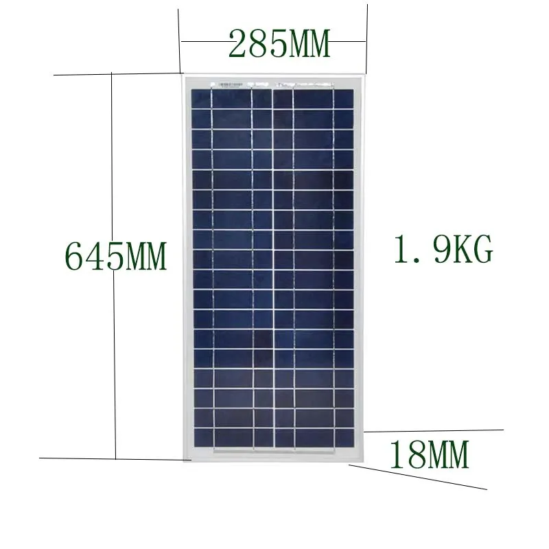 Модуль Pmax :20 Вт Размер и количество ячеек: 125 мм * 31,25 мм 36 шт/4*9 Допуск по уровню поверхности: ± 3% ВМП: 17,2 V Чертёнка: 1.16A Voc: 21,6 V Isc :1.22A Макс. Syst.Oper. Напряжение: 800 в Диоды: 0 by-pass Размер: 645*285*30 мм Вес: 2,1 кг Рабочая температура. Объем:-40 градусов t0 80 градусов Относительная влажность: от 0 до 100% Сопротивление: 227 г стальной шарик падает с 1 м высокой и 60 м/с скорости ветра Гарантия: Pm не менее 90% в 10 лет и 80% в 25 лет